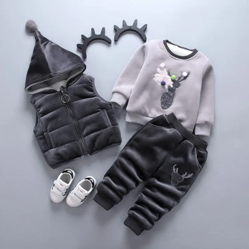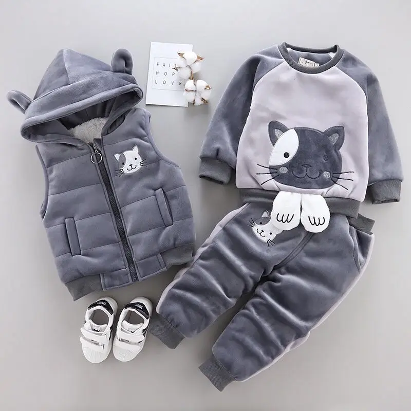Теплый зимний комплект для маленьких мальчиков и девочек, детский утепленный жилет с капюшоном и мультяшным котом, свитер и брюки, спортивные костюмы из трех предметов, детская одежда
