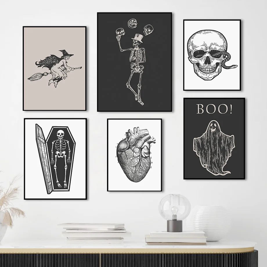 Абстрактные скелеты, Постер в скандинавском стиле, ведьма, сердце, змея, Череп, луна, фаза, настенная Картина на холсте, настенные картины для декора гостиной