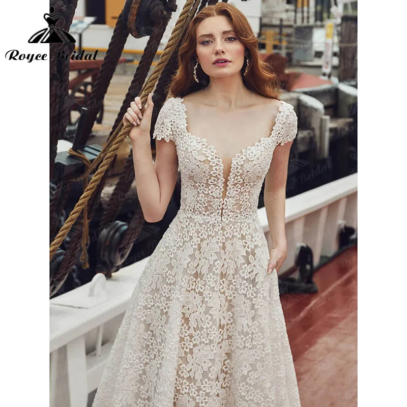 ТРАПЕЦИЕВИДНОЕ свадебное платье с карманами, коротким рукавом, глубоким V-образным вырезом, открытой спиной и шлейфом, кружевное свадебное платье с цветочным рисунком, женское платье