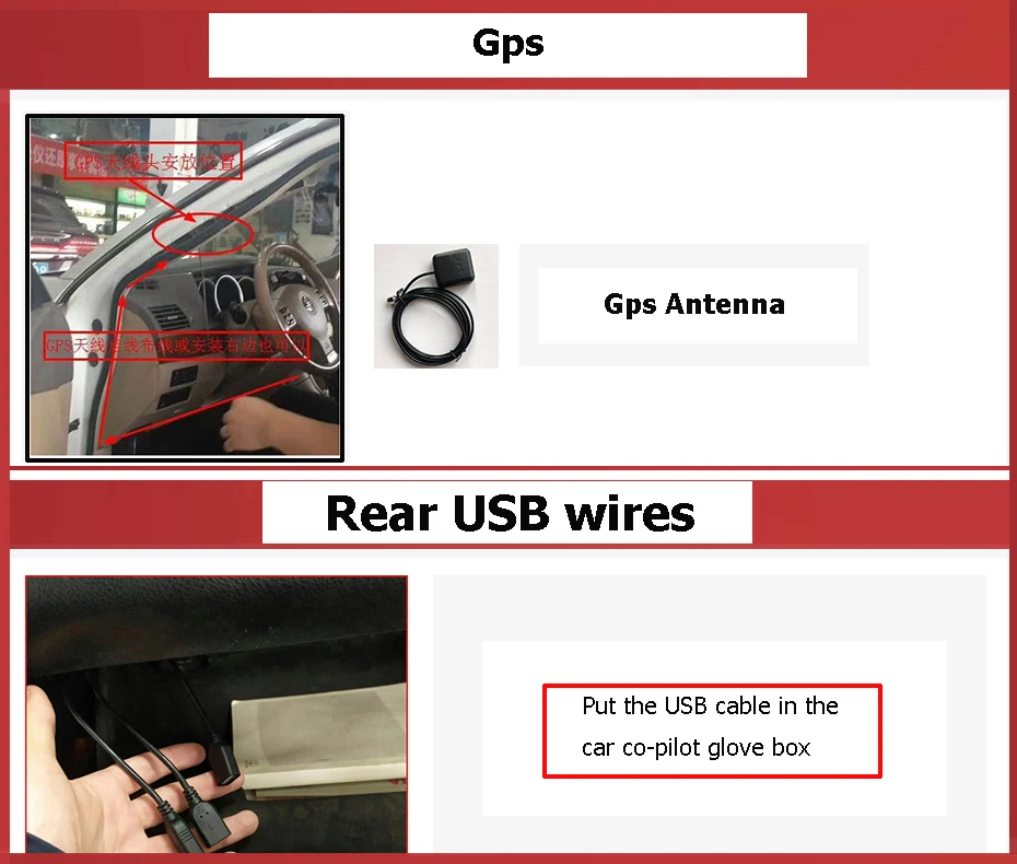 3: не может поддерживать оригинальные автомобильные AUX и USB. Вам нужно использовать AUX и USB кабель, который мы отправили. <положите в ящик для хранения copilot>