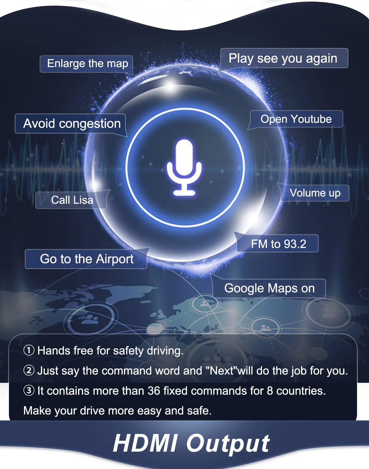 ● Свободные руки для безопасного вождения.● Просто скажите командное слово и «Nex» сделает вашу работу, например, откройте навигацию, откройте музыку, Воспроизведите видео. Содержит более 36 фиксированных команд для 8 стран. Сделайте ваш диск более легким и безопасным.