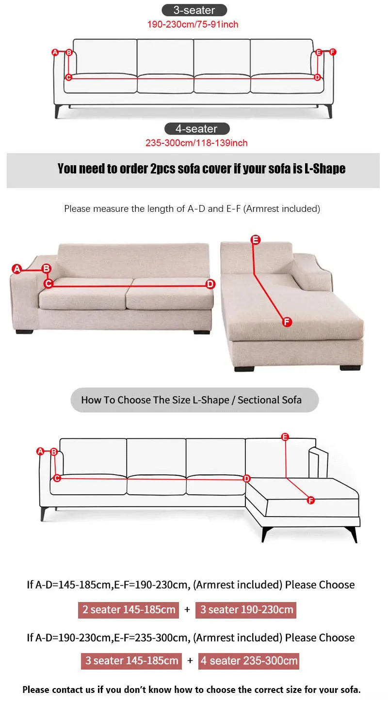 Одноместный чехол для дивана: подходит для дивана90-140 см/35,43-55,12 дюймаЧехол для дивана с двойным сидением: подходит для размера дивана145-185 см/57,09-72,83 дюймаЧехол для дивана с тремя сиденьями: подходит для размера дивана190-230 см/74,80-90,55 дюймаЧехол для дивана на четыре сиденья: подходит для дивана235-300 см/92,52-118,11 дюйма