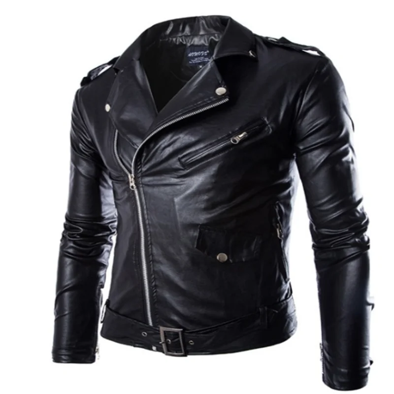 Куртка мужская из искусственной кожи, приталенная, с отложным воротником, жакет, мотоциклетная, осеньзима
