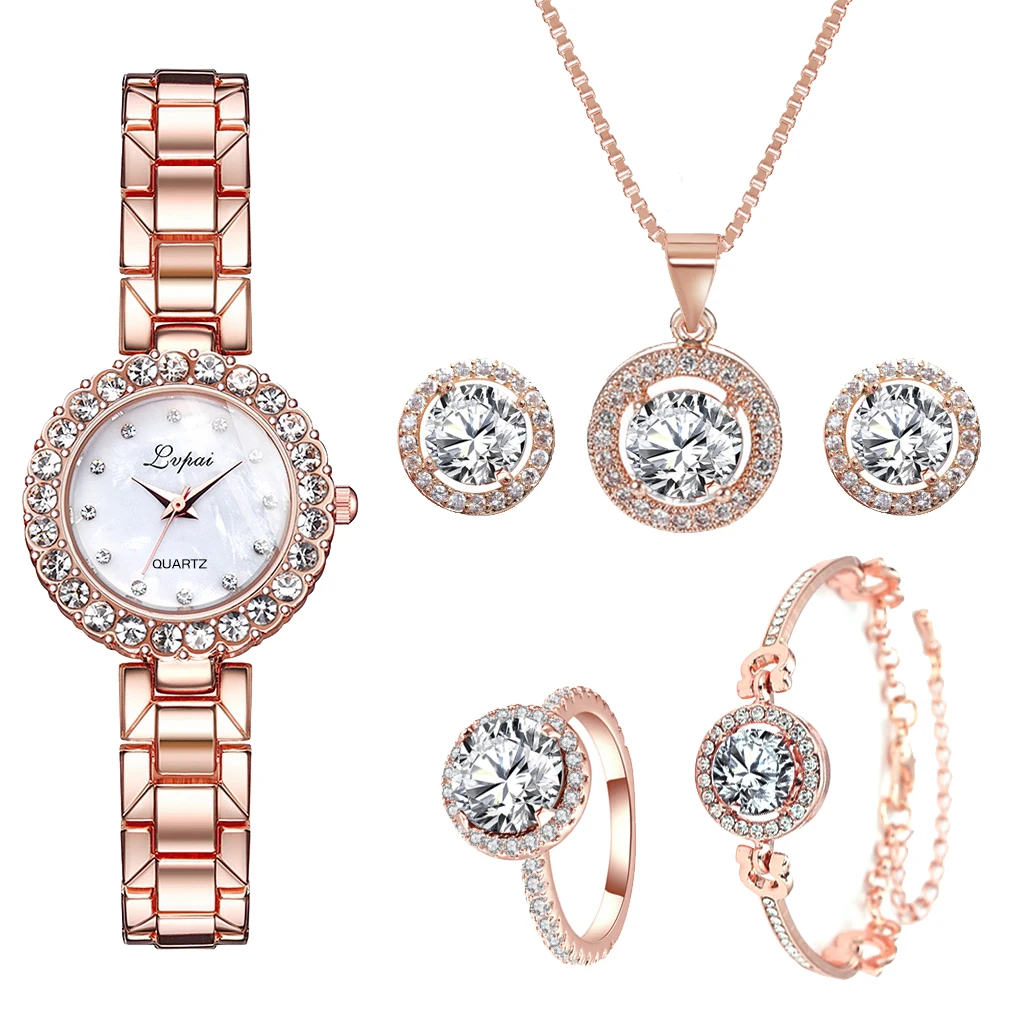 Lvpai роскошные часы с бриллиантами для женщин, розовое золото, женские часы, браслет, ожерелье, серьги, кольца, 6 шт. в комплекте, кварцевые часы Reloj Mujer