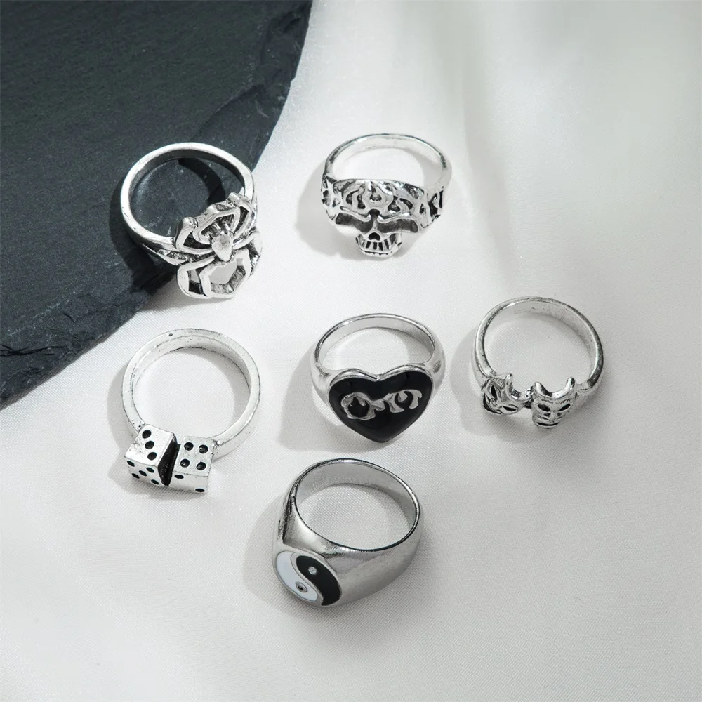 Комплект металлических геометрических колец Ins в стиле панк хип-хоп, Модные посеребренные игральные кости, Череп, голова, сердце, кольцо на палец, трендовые ювелирные изделия в стиле рок, подарок