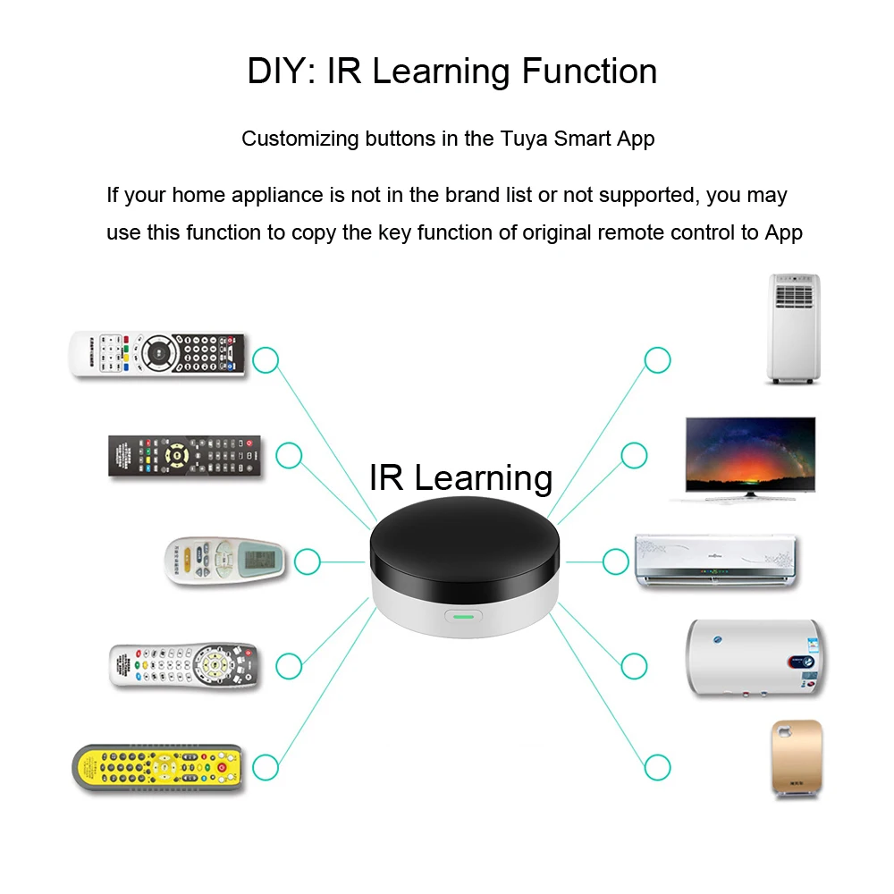 Кроме того, он имеет функцию обучения, позволяет Копировать Ключевые функции оригинального дистанционного управления в приложение (настройки кнопок в умном приложении Tuya). Вы также можете скопировать пульт дистанционного управления RF433 для реализации продукта, который контролирует беспроводной пульт дистанционного управления RF433.