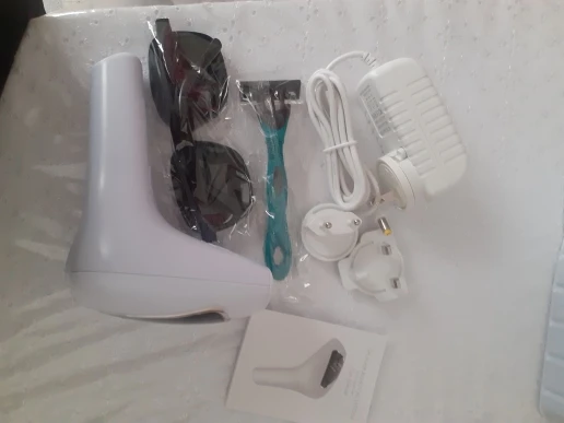 Заказ пришёл точно в срок, упакован хорошо, аппарат работает. В комплекте очки и бритва, а также 3 вилки, для разных типов розеток. Есть инструкция на русском языке. Всё работает. По результатам надо смотреть в динамике.