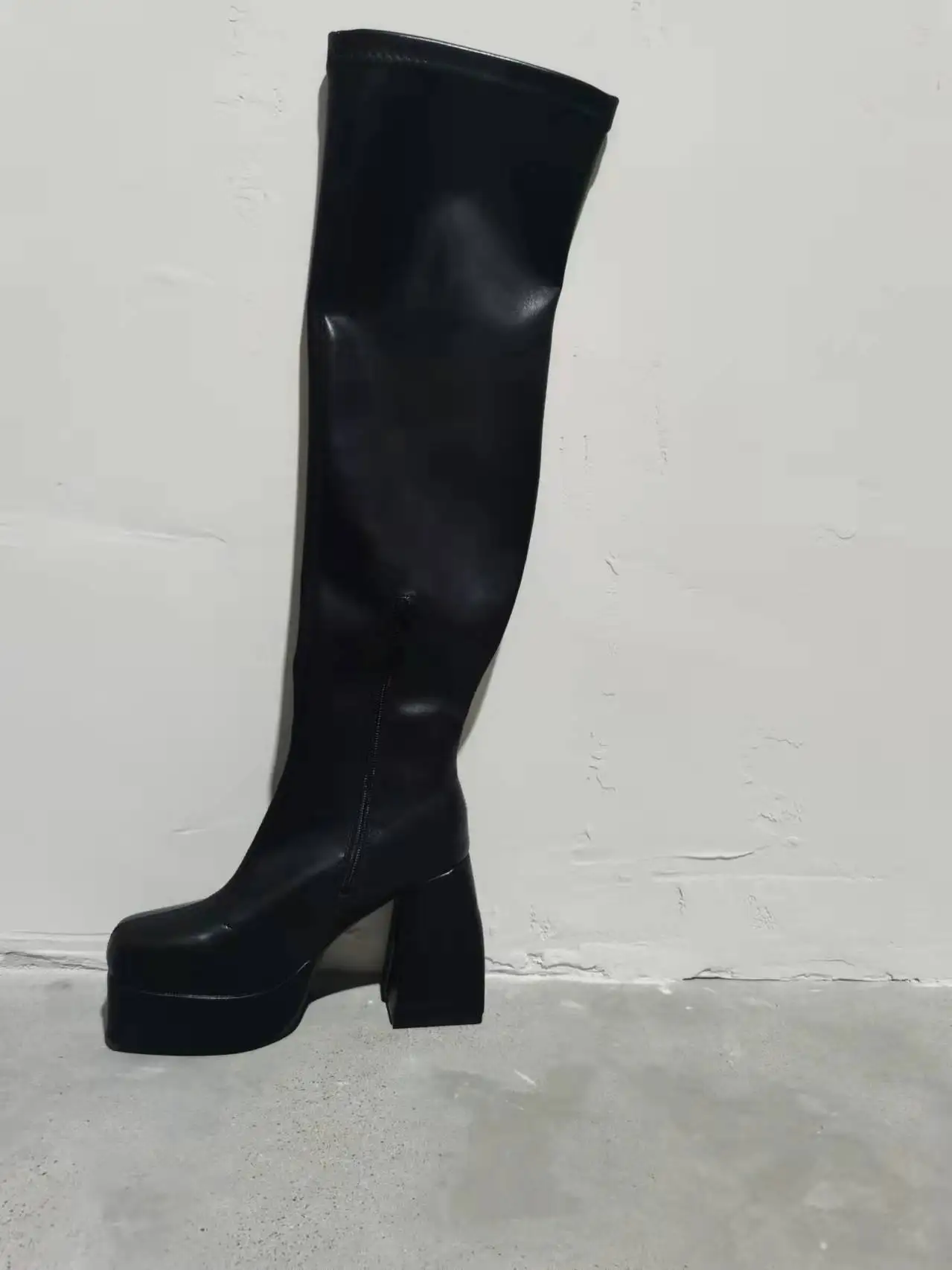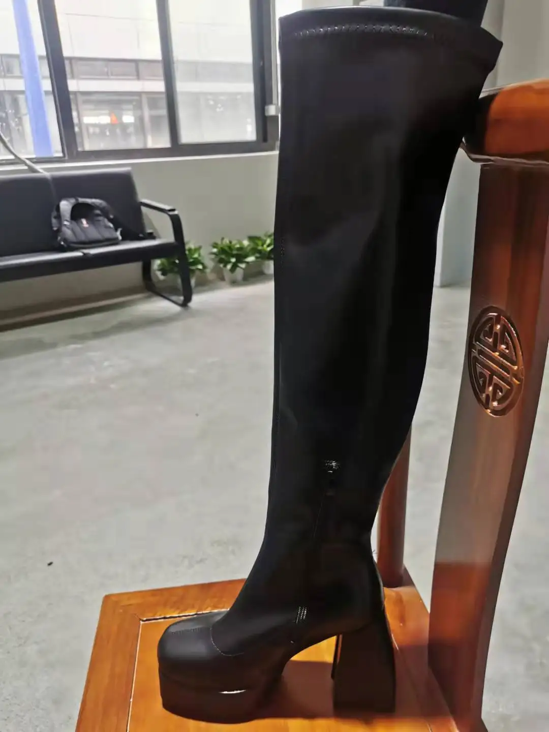 Женские сапоги на высоком каблуке, Черные Сапоги выше колена на пла...