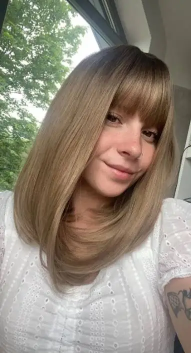 Він дуже м’який, не так легко сплутується і не тягне волосся, його в помірній кількості. Найбільше мені подобається те, що він виглядає надзвичайно природно, колір схожий на попелястий блонд, бахрома трохи довга, щоб ви могли підлаштувати її під свій смак. я любив це