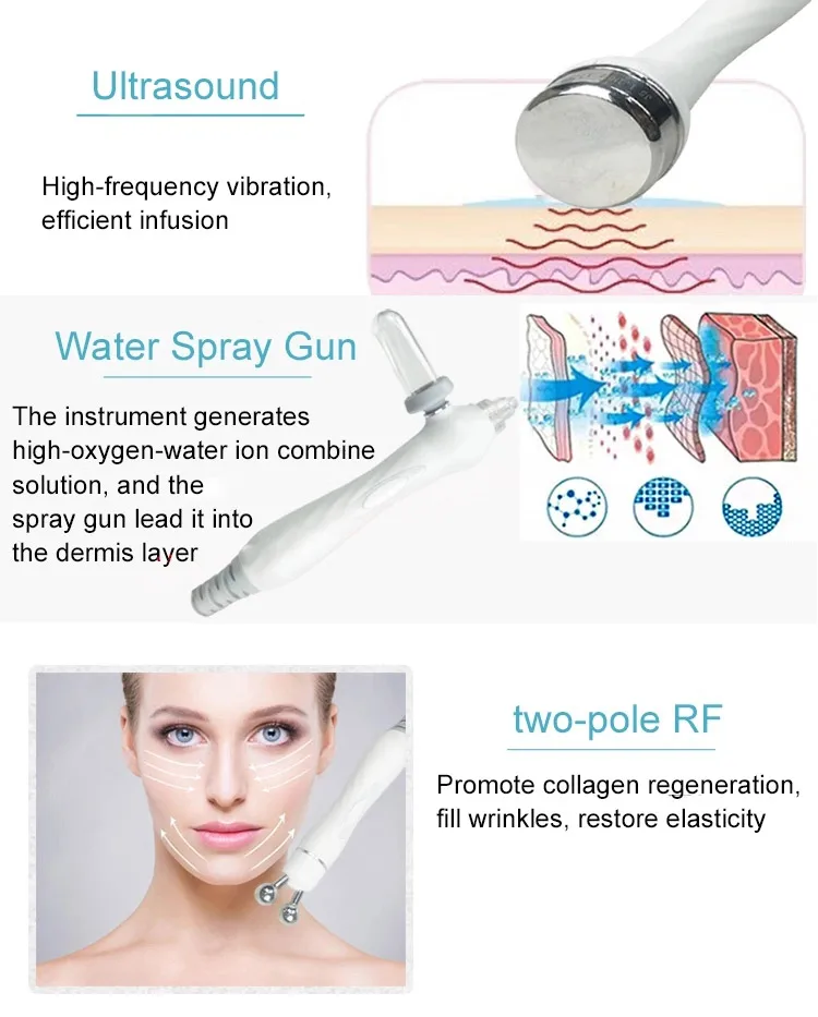 Гидро кислородная дермабразия машина использует кислород под экстремальным давлением и водой, принимает крошечные капли воды, через спрей-тип, чтобы действовать на кожу. Он может проникать в питательные компоненты для пор и трещин кожи от эпидермиса до слоя дермы, а затем способствовать возрождению клеток, быстро и напрямую поставлять богатые питательные вещества для кожи. Одновременно, он может очистить глубокую грязь в эпидермисе. Кислород экстремального давления и питательной жидкости может стимулировать возрождение клетчатой ткани в дерме, сделать метаболизм клеток. Для улучшения темной, желтой кожи, хлоазмы, получения хорошего эффекта от удаления морщин, омоложения кожи и т. д.