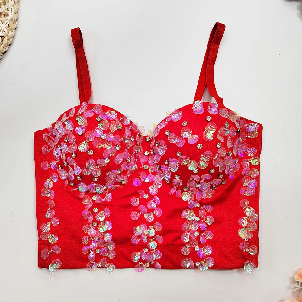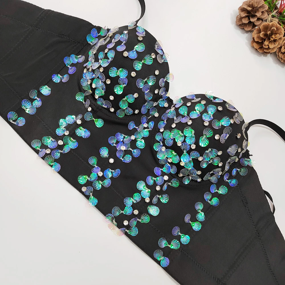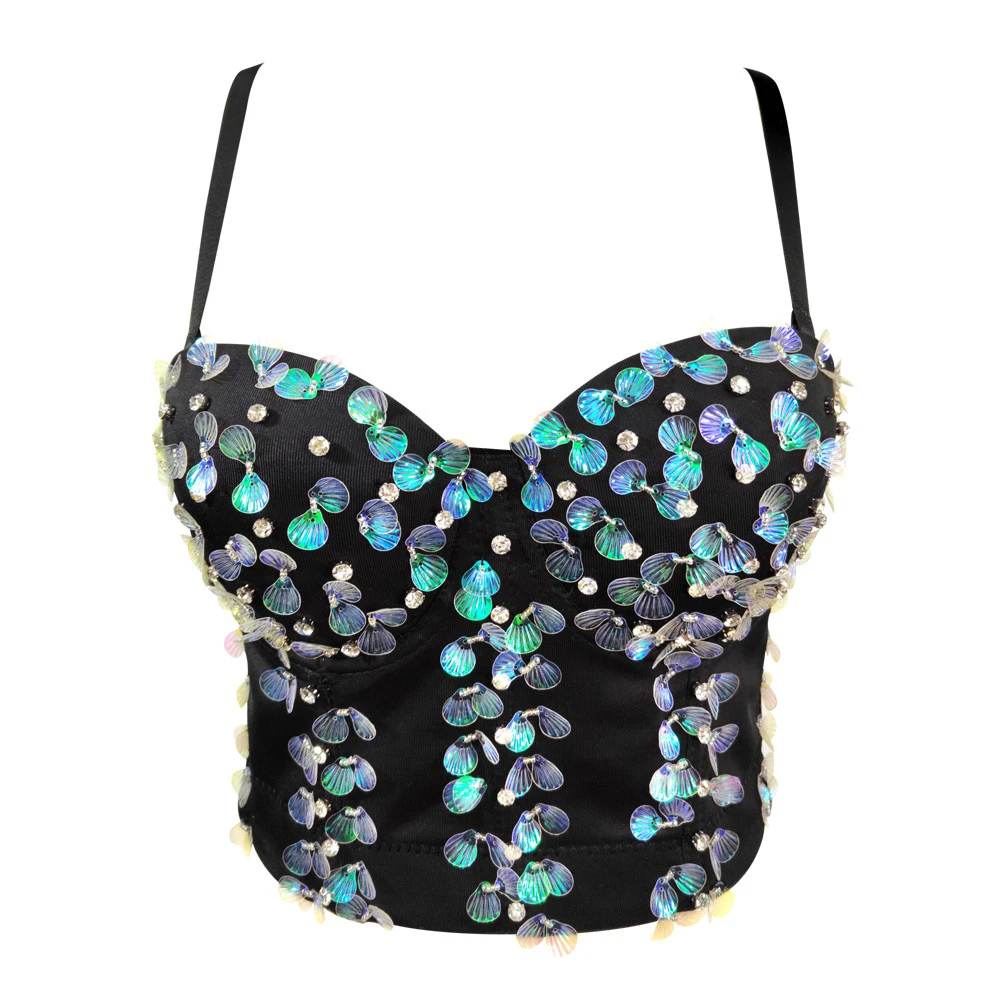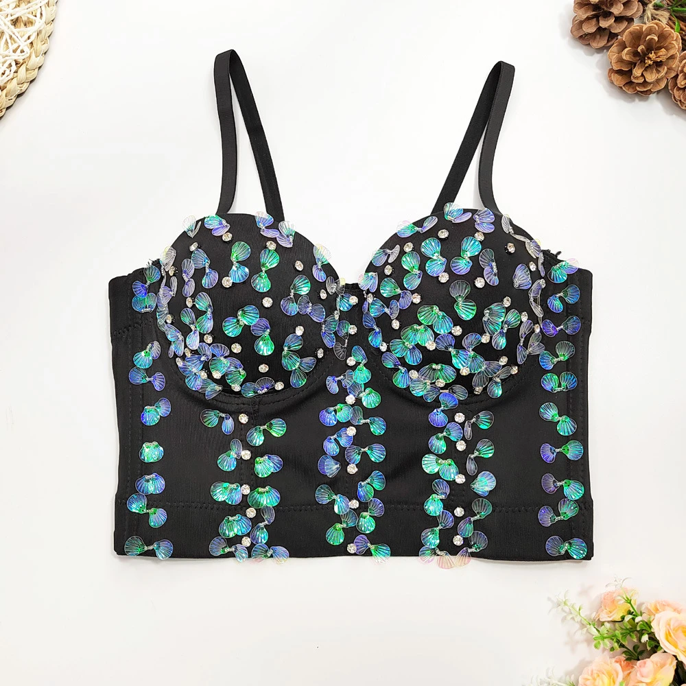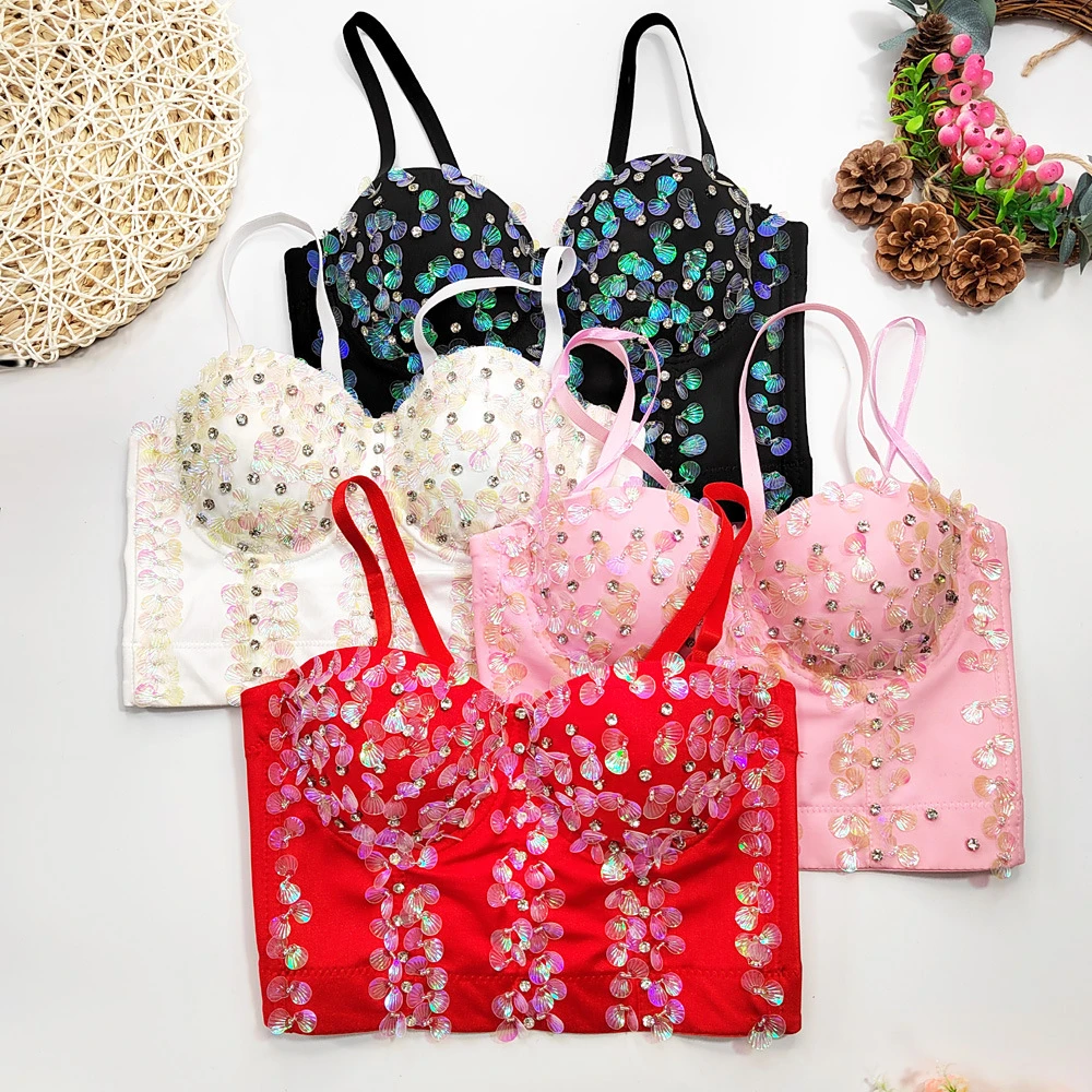 Лето 2022, сексуальный женский корсет с чашками, разы, блестки, для ночного клуба, для вечерние ринки, короткий женский топ на бретельках, Укороченный бюстгальтер YH8300