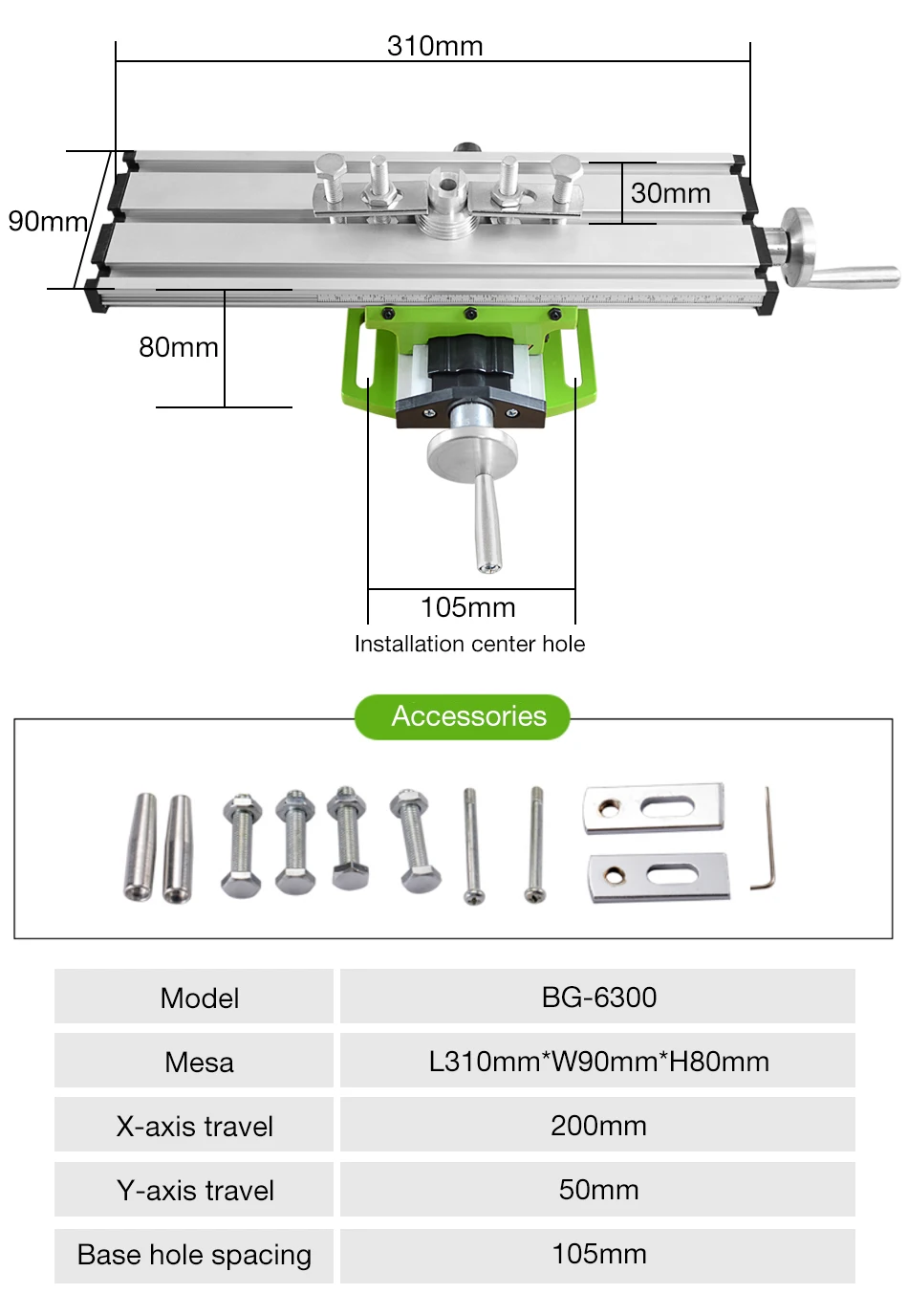 Модель: BG-6300Размер стола: 300*90 ммПеремещение по оси X: 200 ммПеремещение по оси Y: 50 ммX Регулировка шкалы оси Y:1 круг = 1,25 ммПодразделение следов = 0,05 ммСвинцовые винты M8X1.25
