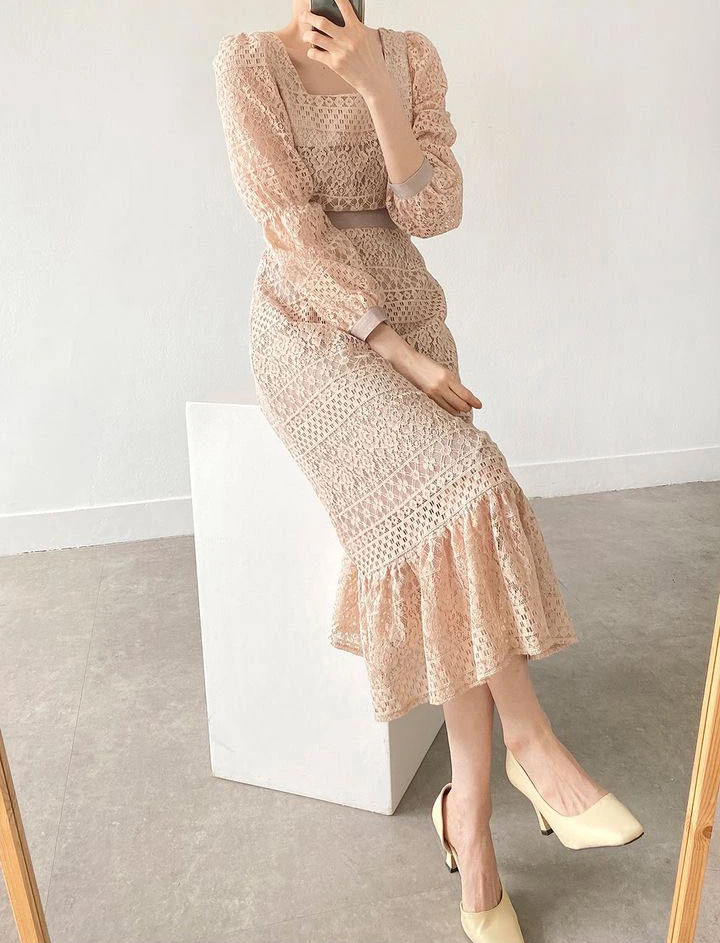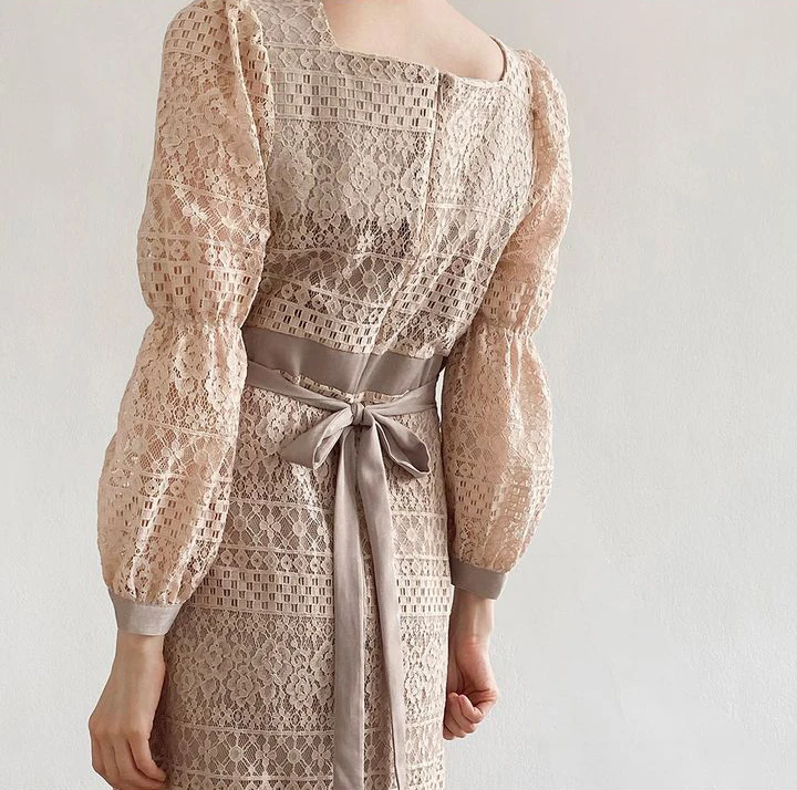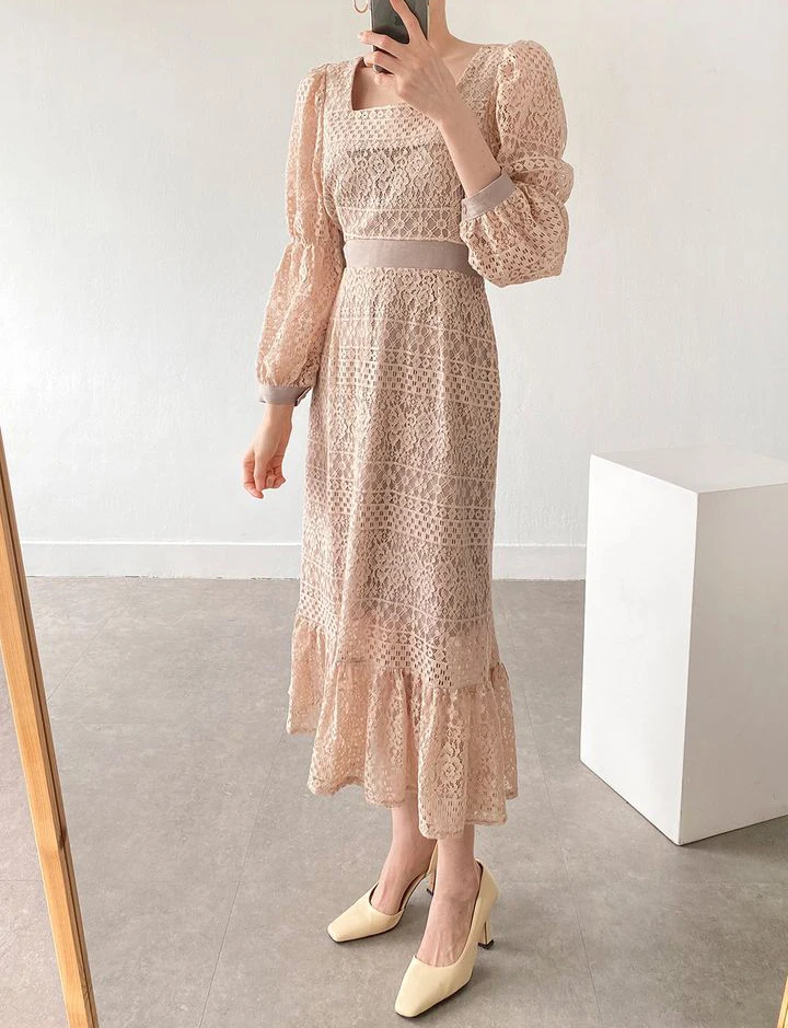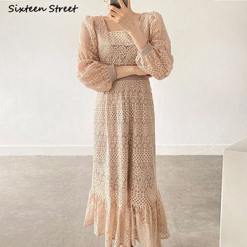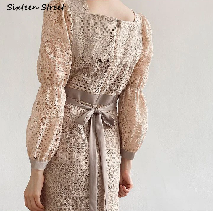 Женское винтажное кружевное платье, модельное платье абрикосового цвета с квадратным вырезом и длинным рукавом, ажурное праздничное платье с цветочным узором и крючком, весна 2022