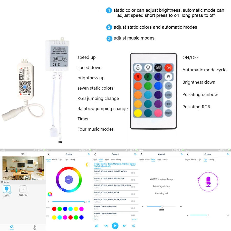 Пульт дистанционного управления требует аккумуляторов (посылка не содержит батарей)Варианты Применения: фоновые лампы для телевизора, цветные огни rgbОбласти применения: Автомобильный светильник-полоски, атмосферный контрастный светильник-полоскиЦвет температуры: 24-кнопочным инфракрасным контроллер + адаптер + светильник полосы/44-кнопочным инфракрасным контроллер + адаптер + светильник полосы/входит ПДУ с 24 кнопками Wi-Fi контроллер + адаптер + светильник полосы