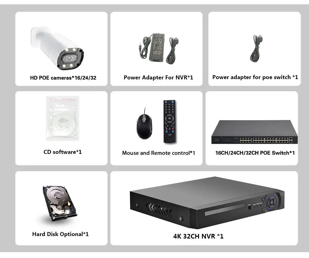 1 сетевой видеорегистратор 32CH 4K NVR; 16/24/32 x HD 8.0MP POE IP Крытый Открытый ИК Полный Цвет ночного видения атмосферостойкие камеры; 1x16/ 24CH/32CH POE переключатель 1x источник питания для POE Switch 1 x Блок питания для NVR; 1 х USB мышь для NVR; 1 компакт-диск программного обеспечения для NVR; 1 пульт дистанционного управления для NVR; Жесткий диск опционально!