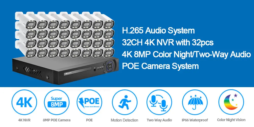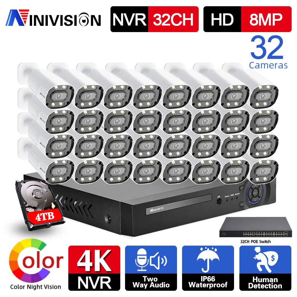 H.265 + 32CH 4K NVR 8.0MP Крытый Открытый Цвет ночного видения двухстороннее аудио POE IP камера комплект HD 8MP видео камера безопасности