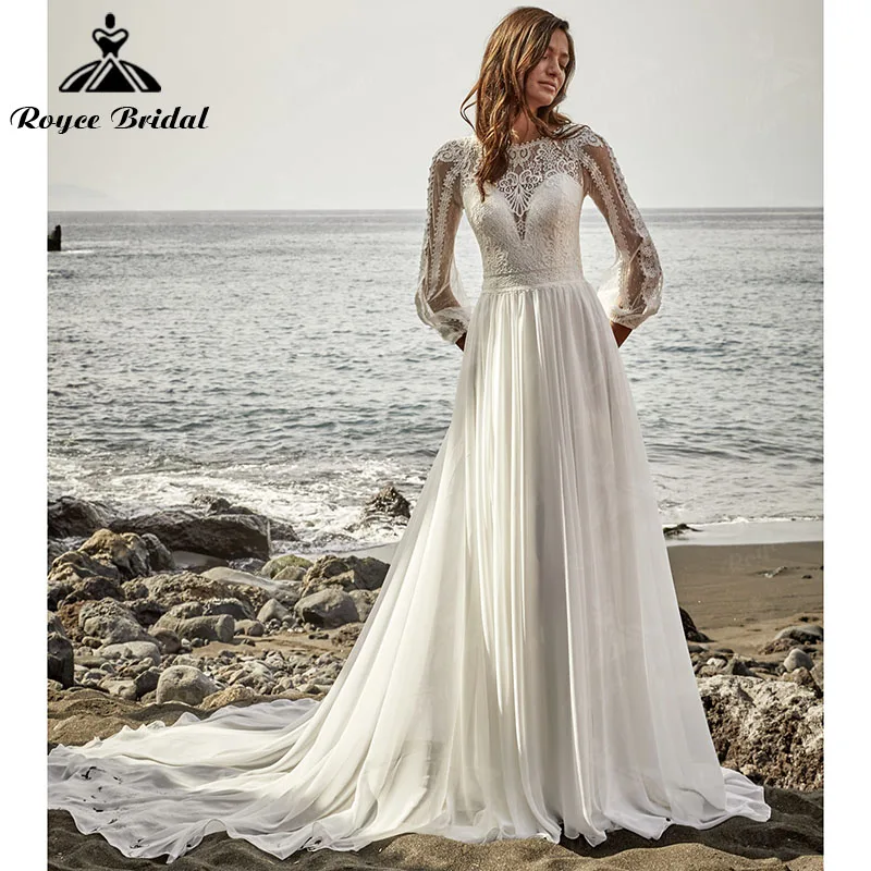 Платье Свадебное ТРАПЕЦИЕВИДНОЕ с пуговицами сзади, шифоновый кружевной топ с длинными рукавами-фонариками в стиле бохо, иллюзия