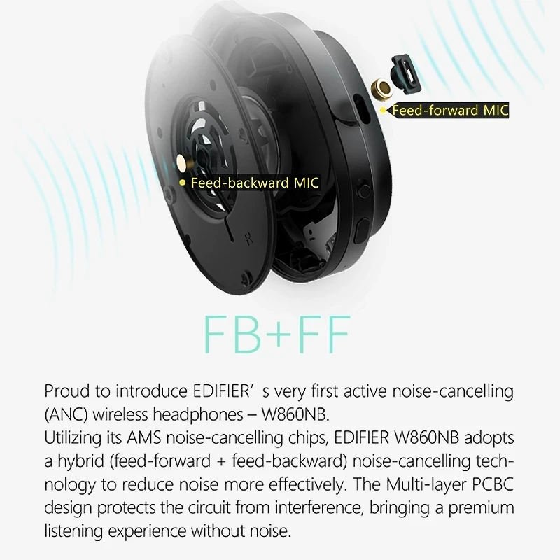 EDIFIER W860NB использует гибридную технологию шумоподавления (подача вперед + подача назад) для более эффективного снижения уровня шума.