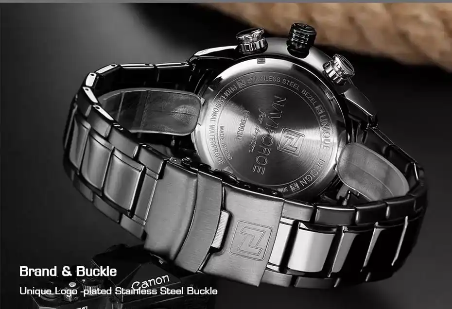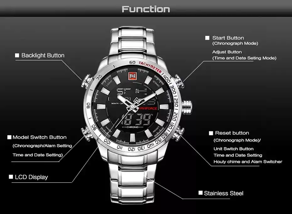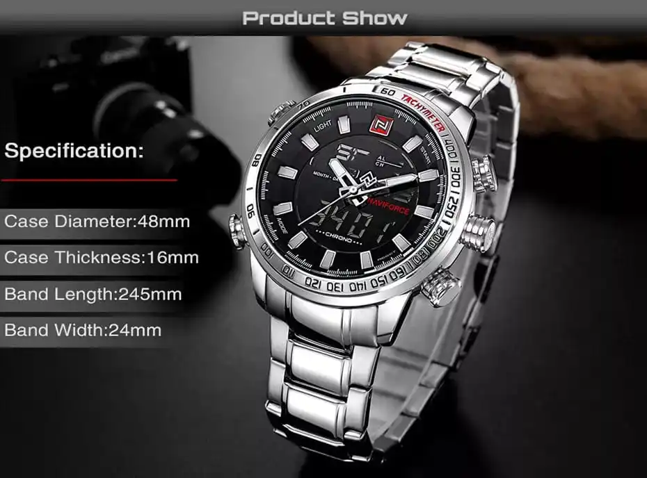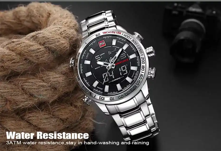 Часы наручные Naviforce Мужские кварцевые, роскошные спортивные водонепроницаемые цифровые из нержавеющей стали с двойным дисплеем, 9163