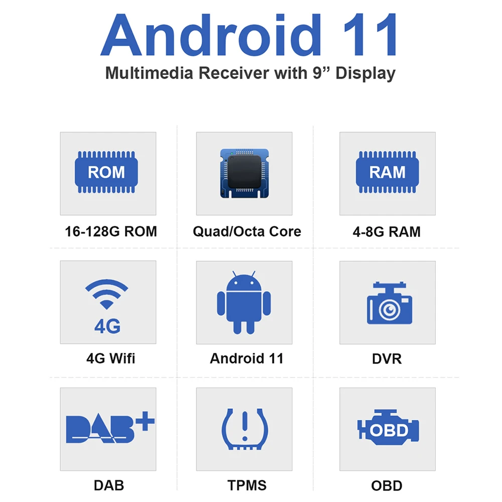 9 дюймов Экран + руль управления + DSP (необязательно) + автомобильное автоматическое конфигурирование (опционально) + встроенный Wifi + бесплатная gps-навигация + поддержка задней камеры + зеркальная связь + Bluetooth + Встроенный микрофон + FM/AM + RDS (опционально) + Поддержка функции USB DVR + Функция DAB + 1080P Vedio Play + HD 1024*600 + Поддержка системы контроля давления в шинах + панорамный вид на 360 градусов (Опционально) + 4G Wifi (опционально)