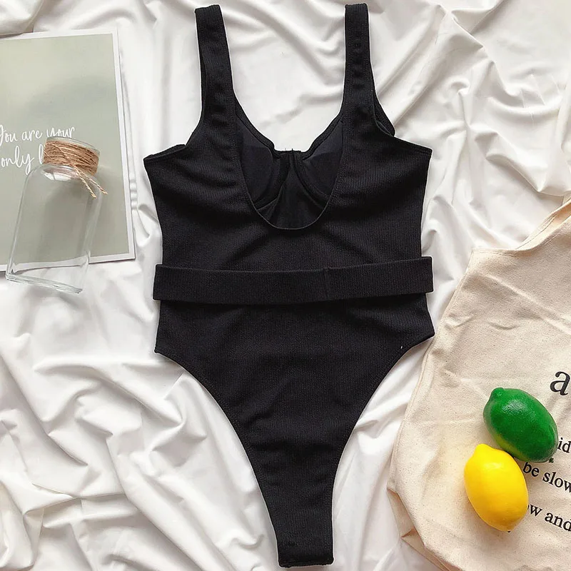 Новый слитный купальник с пуш-ап, купальник в рубчик, женское черное боди 2022, сексуальный купальный костюм с открытой спиной, Женская пляжная одежда с поясом
