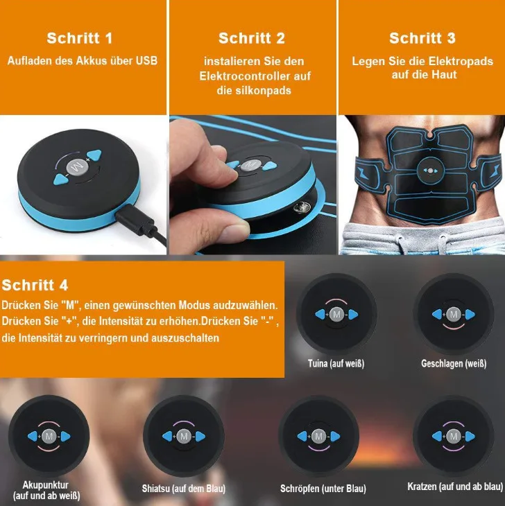 Стирайте область вашего тела, где вы собираетесь использоватьЗарядка аккумулятора через usbInstalieren sie den elektrocontroller auf die silkonpadsОторвите заднюю наклейку, а затем прикрепите ее между ребрами и бедрамиВключите хост, нажмите «M», чтобы настроить желаемый режим, нажмите «+», чтобы увеличить интенсивность, нажмите «-», чтобы уменьшить интенсивностьАвтоматическое выключение через 5 секунд, если вы не прикрепить к корпусу