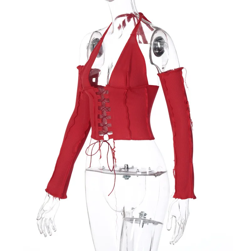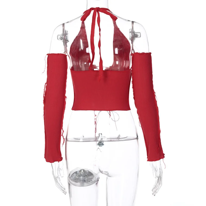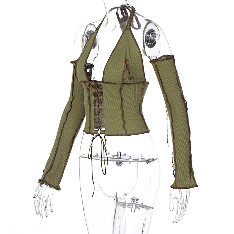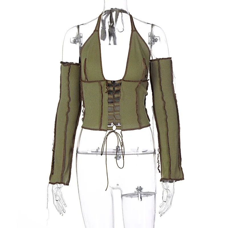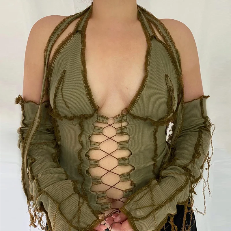 Ажурная Сексуальная футболка Y2K с рукавом и глубоким V-образным вырезом