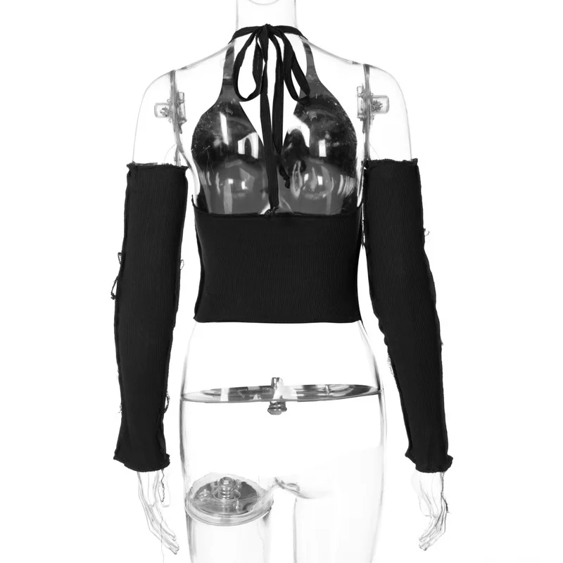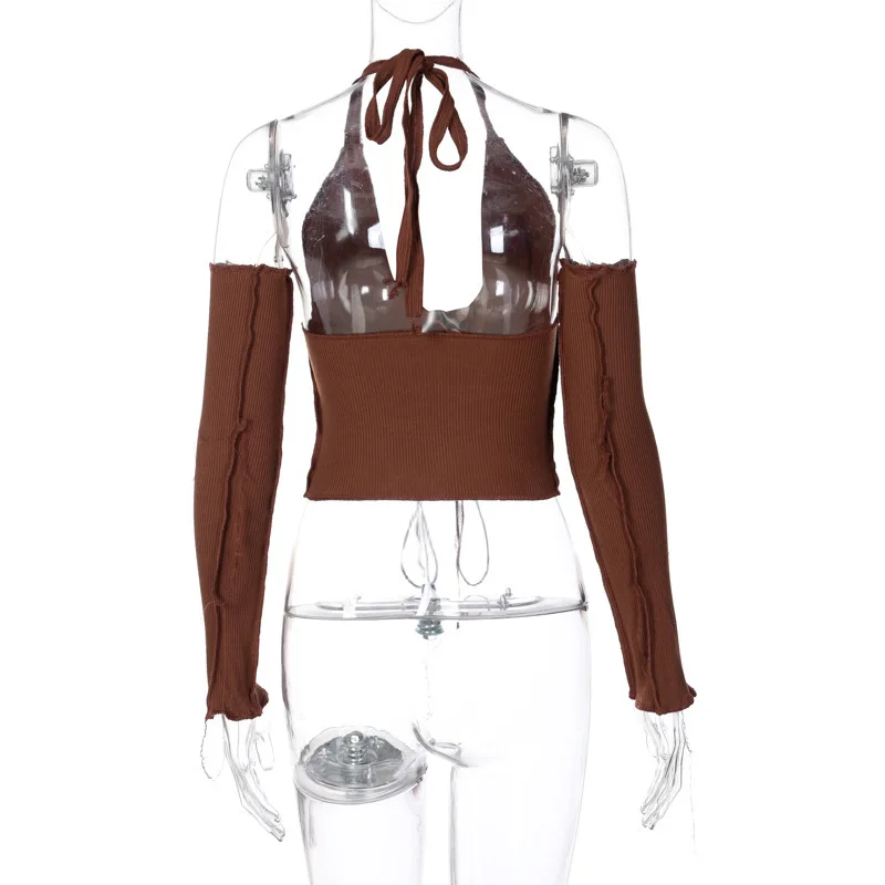 Женский укороченный топ в рубчик, с открытой спиной и длинным рукавом
