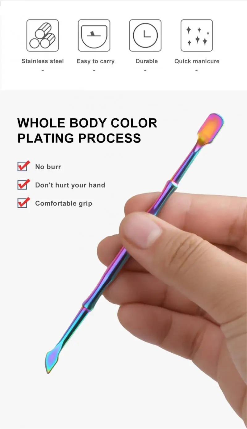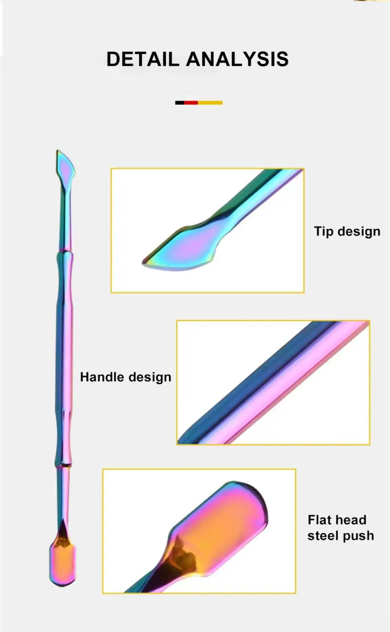3. Наклонный Стальной Толкатель. Он может погружаться глубоко в шов ногтя, чтобы очистить грязь и так далее. Стальной Толкатель с плоской головкой, быстро очищает грязь и омертвевшую кожу на поверхности ногтей