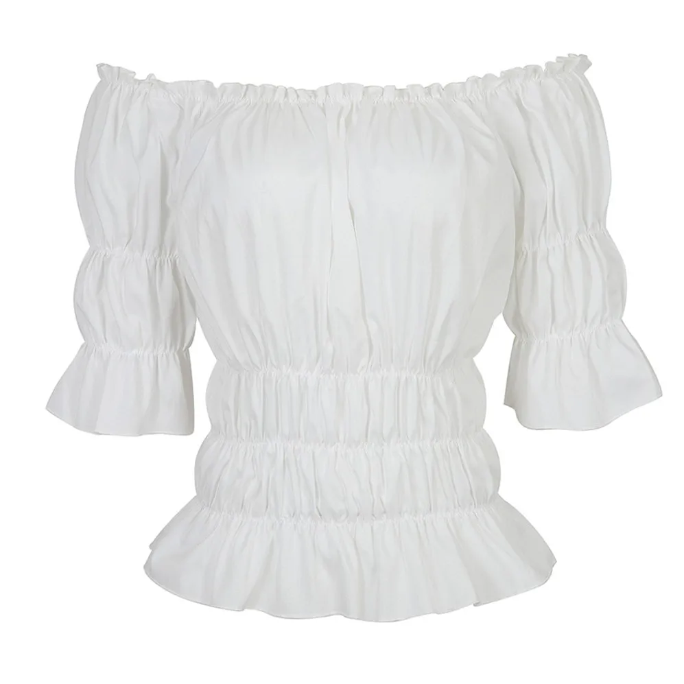 1. Женская модная сексуальная блузка, укороченный топ с оборками, с открытыми плечами и широким воротником, отличное качество, эластичная хлопковая ткань.2. Рукава средней длины с эластичными манжетами; Вырез с эластичной резинкой; Свободный крой; Мягкая и удобная вискозная ткань; Присборенная Талия