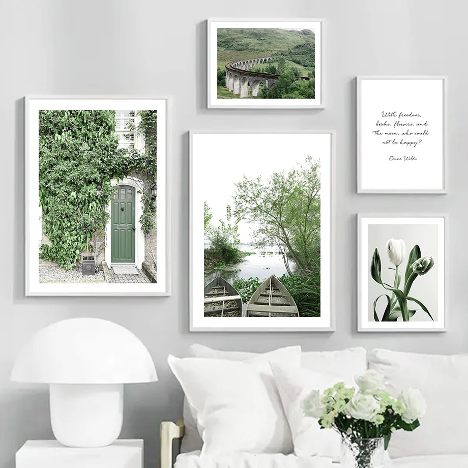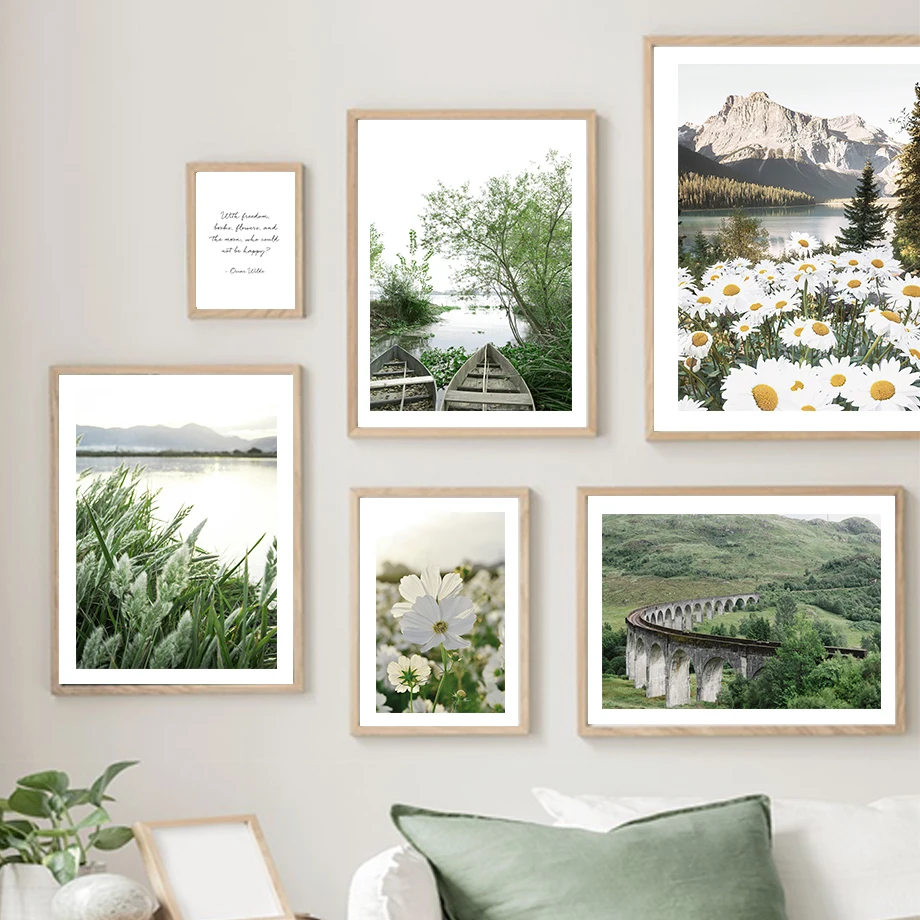 Настенная Картина на холсте с изображением гор, озера, лодки, зеленых листьев, дерева, цветов, природы, плакаты и принты, настенные картины для декора гостиной