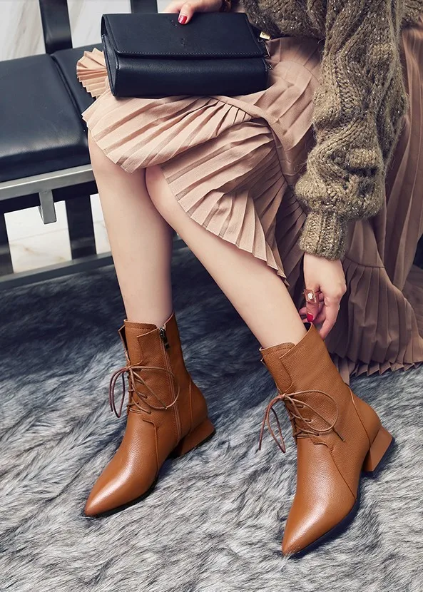 Женские ботильоны; Цвет коричневый; Сезон осень-зима; Новые пикантные ботинки с острым носком на среднем каблуке; Женские ботинки на шнуровке на толстой подошве в британском стиле; Большие размеры
