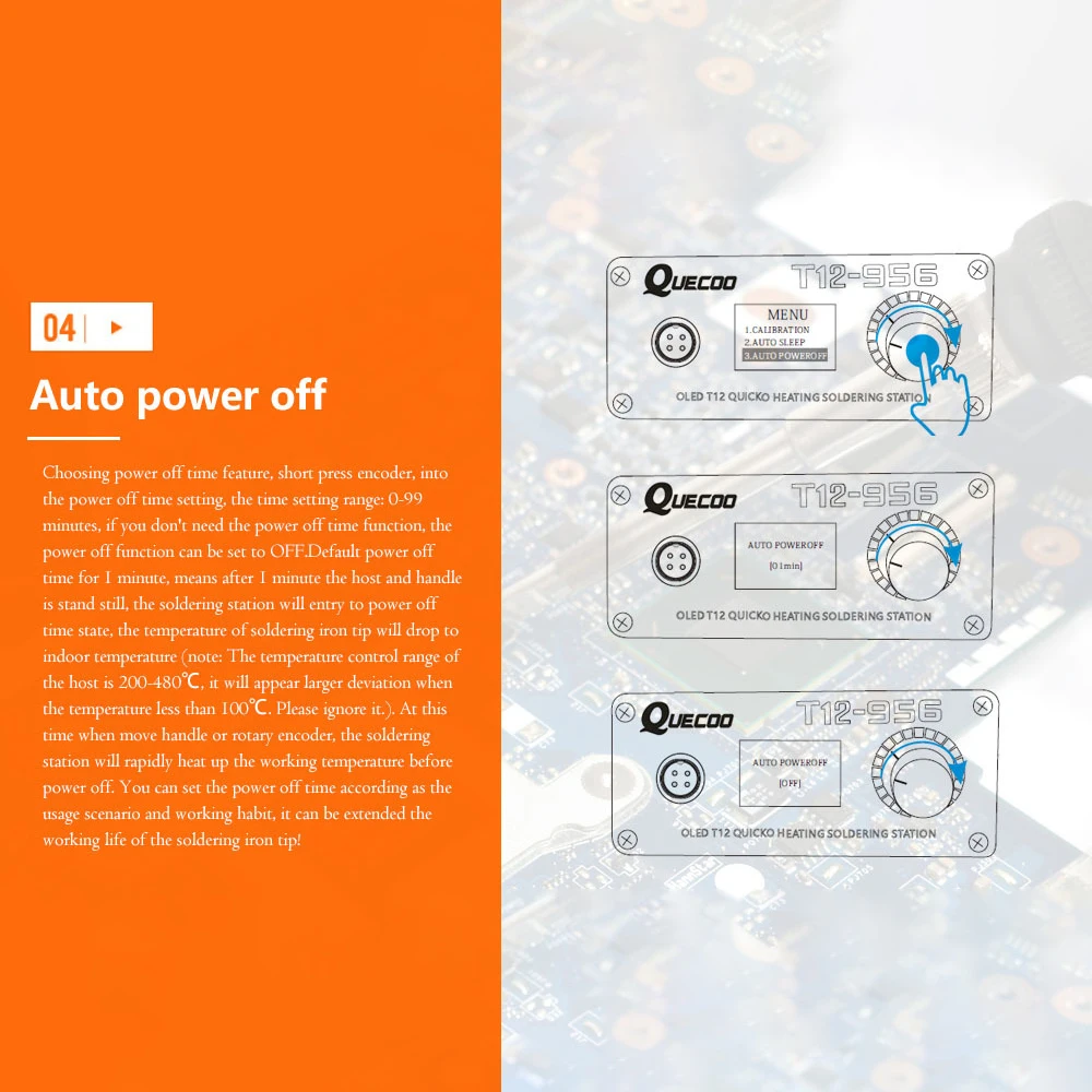 Время выключения по умолчанию составляет 1 минуту. После того, как хост войдет в спящее состояние в течение 1 минуты и все еще не используется, хост автоматически войдет в состояние отключения. В это время температура наконечника паяльника будет медленно снижаться до комнатной температуры (Примечание: диапазон контроля температуры хоста составляет 200-480 ℃, когда температура ниже 100 ℃, будет большое отклонение в отображаемой температуре, пожалуйста, игнорируйте это.) Когда ручка или поворотный кодер удерживаются, хост быстро нагревается до рабочей температуры перед сном. Время отключения может быть установлено в соответствии с условиями использования и привычками работы, чтобы продлить срок службы наконечника паяльника и защитить безопасность вас, вашей семьи и друзей!