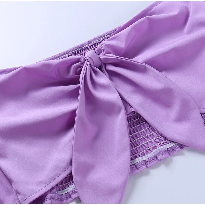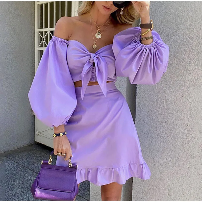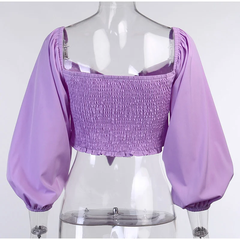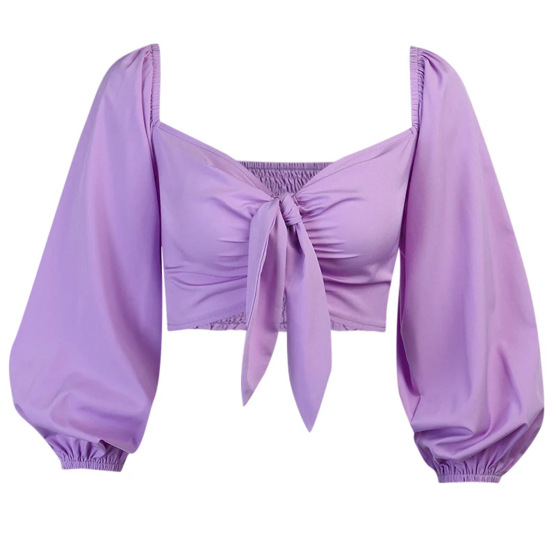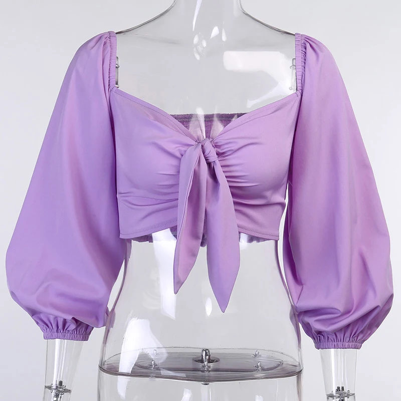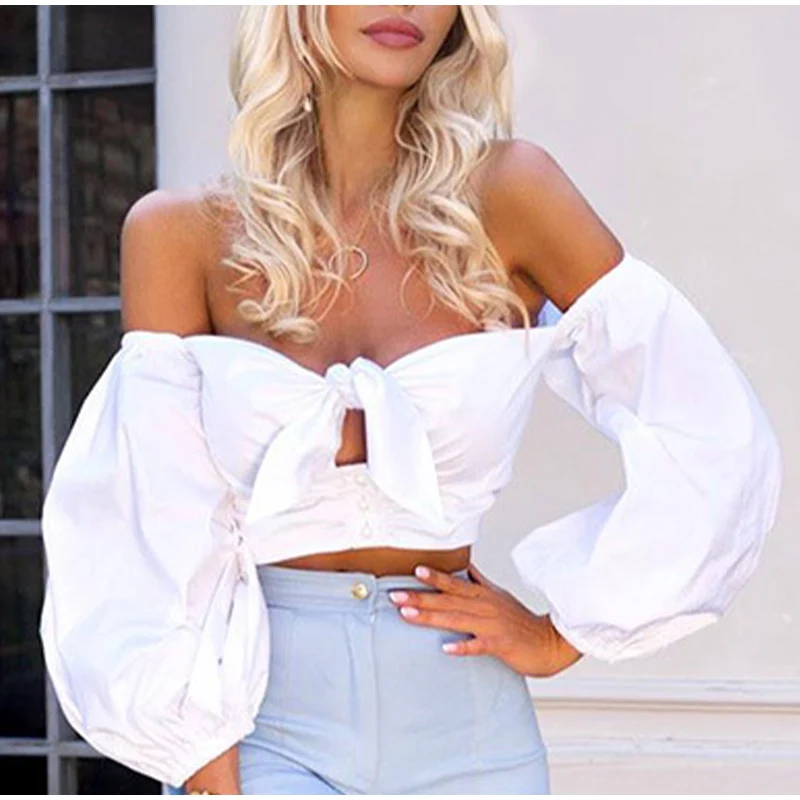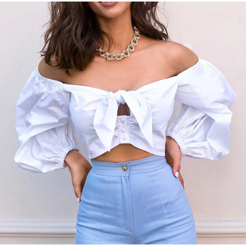 Женский укороченный топ с рукавами-фонариками и открытыми плечами, новинка весны-лета 2022, однотонная блузка с узлом и воротником-лодочкой, женские сексуальные милые блузки
