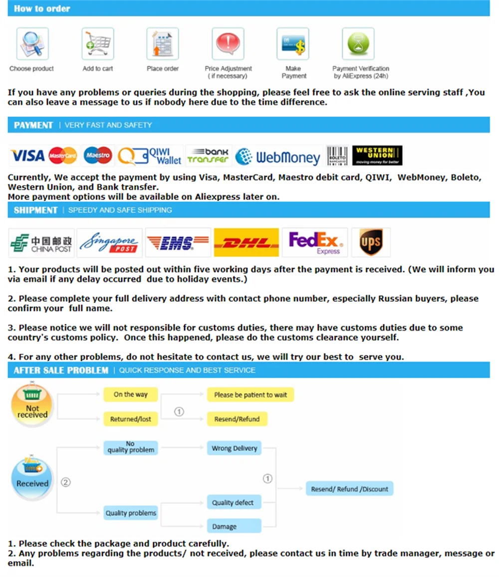 1. Пожалуйста, проверьте адрес доставки . Если Вы заполняете неверную информацию и хотите изменить адрес доставки, пожалуйста, свяжитесь со службой поддержки клиентов, чтобы изменить ее, прежде чем посылка будет отправлена. После отправки посылка информация не может быть изменена.