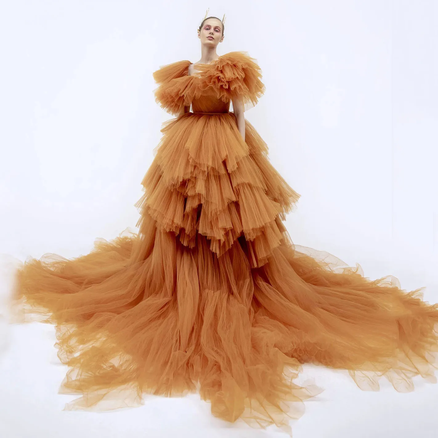 Очаровательное Тюлевое вечернее платье с оборками Вечерние платья с очень пышным длинным шлейфом Золотое официальное платье для выпускного вечера платье для фотосъемки на заказ