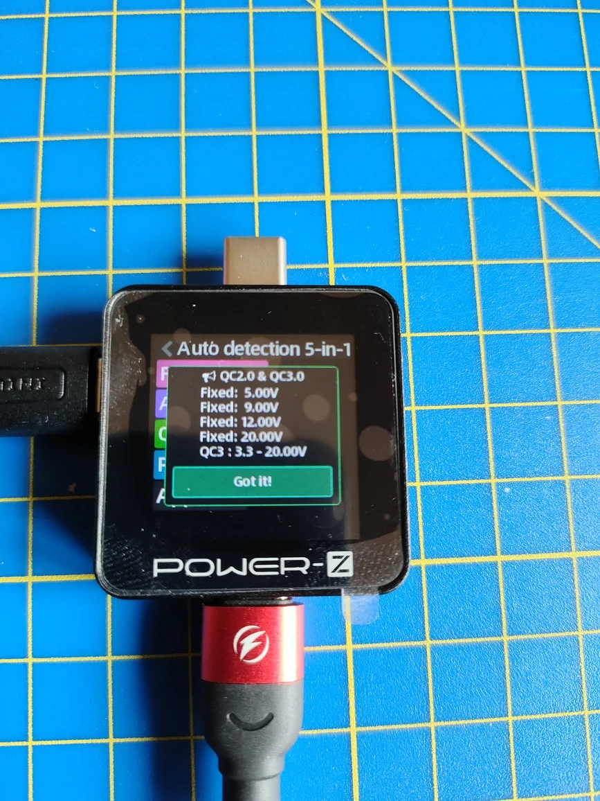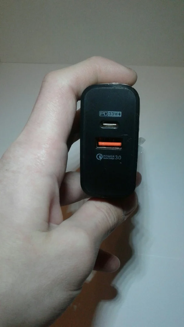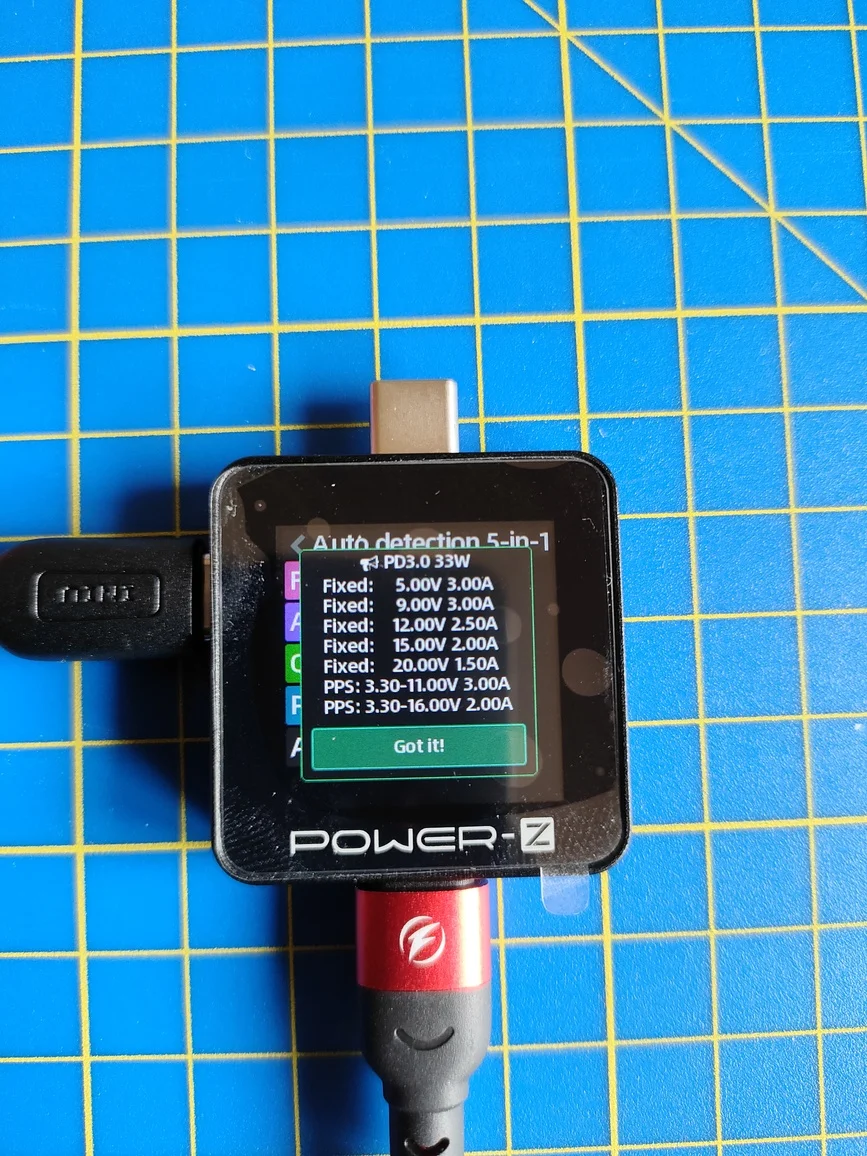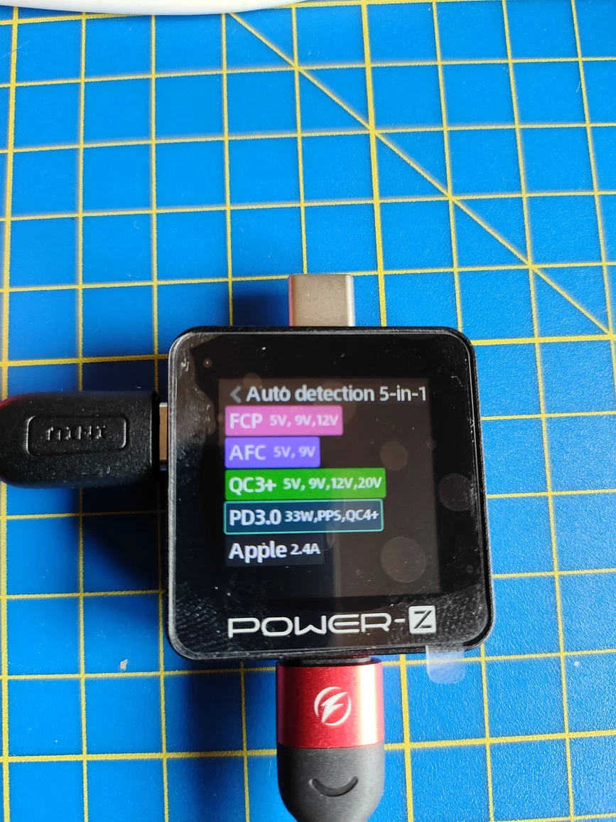 Зарядное устройство работает так, как ожидалось и заявлено. Он обеспечивает 33 Вт с PD 3,0 (11 вольт при 3,3 ампер). Результат, который вы видите на фотографиях, сделан с другим кабелем, так как оригинальный работает, но он не распознан тестером питания Z KM0002C.