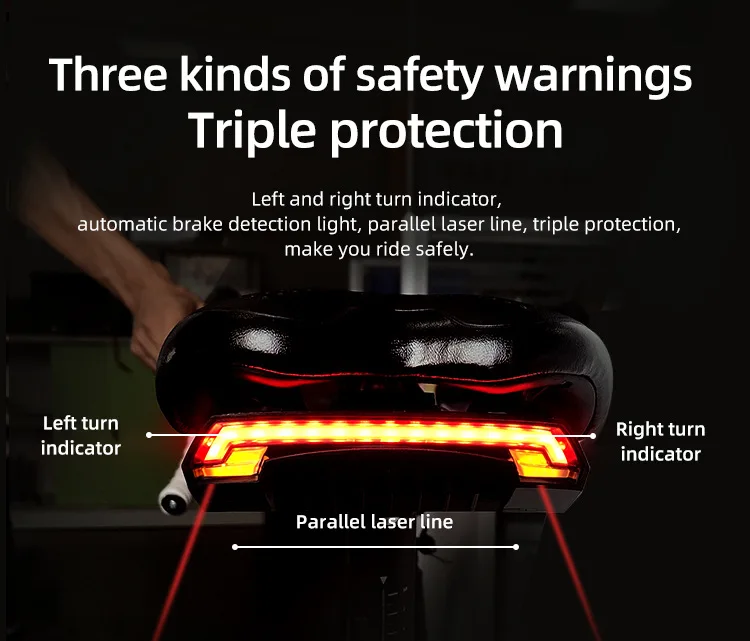 4. Автоматическое обнаружение тормозов: при торможении задний светильник автоматически переключается на мигающий, чтобы предупредить приближающиеся к вам транспортные средства, чтобы гарантировать вам безопасную езду