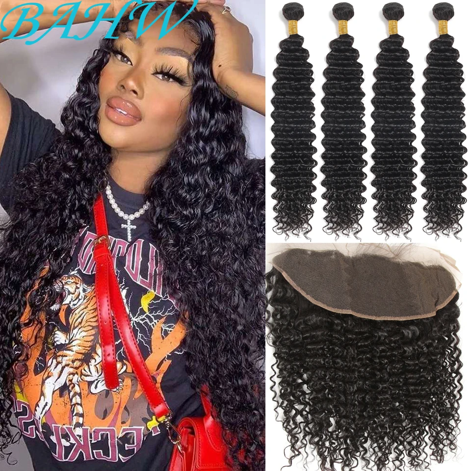 BAHW бразильские пряди глубоких волн с фронтальными человеческими волосами, пряди с застежкой, Реми, кружевная Фронтальная застежка с пряди, 30 дюймов