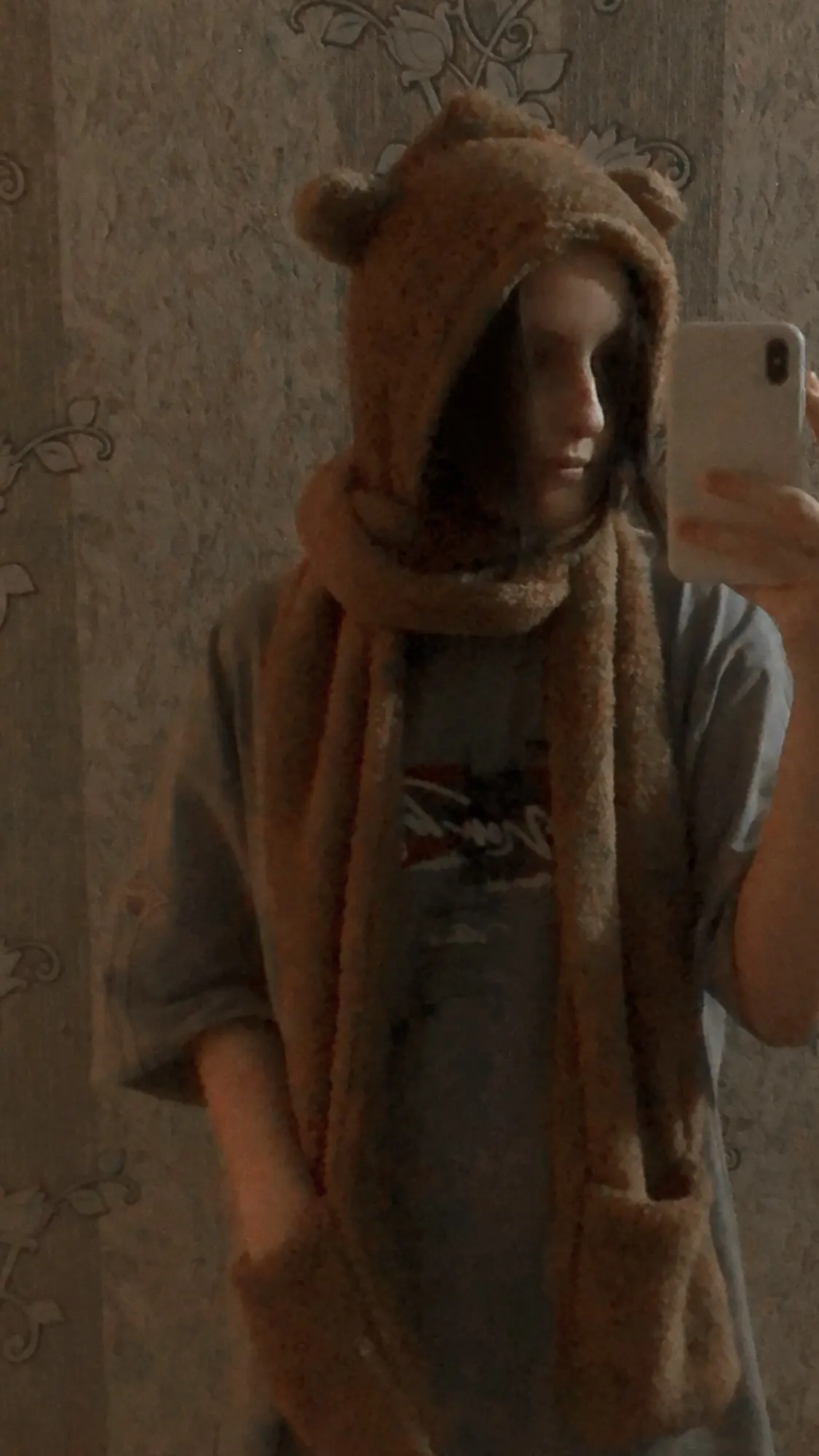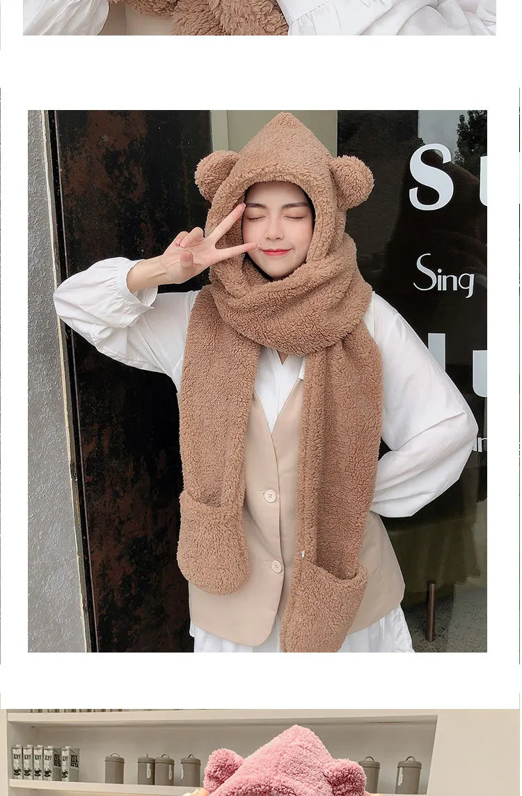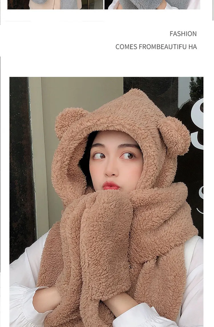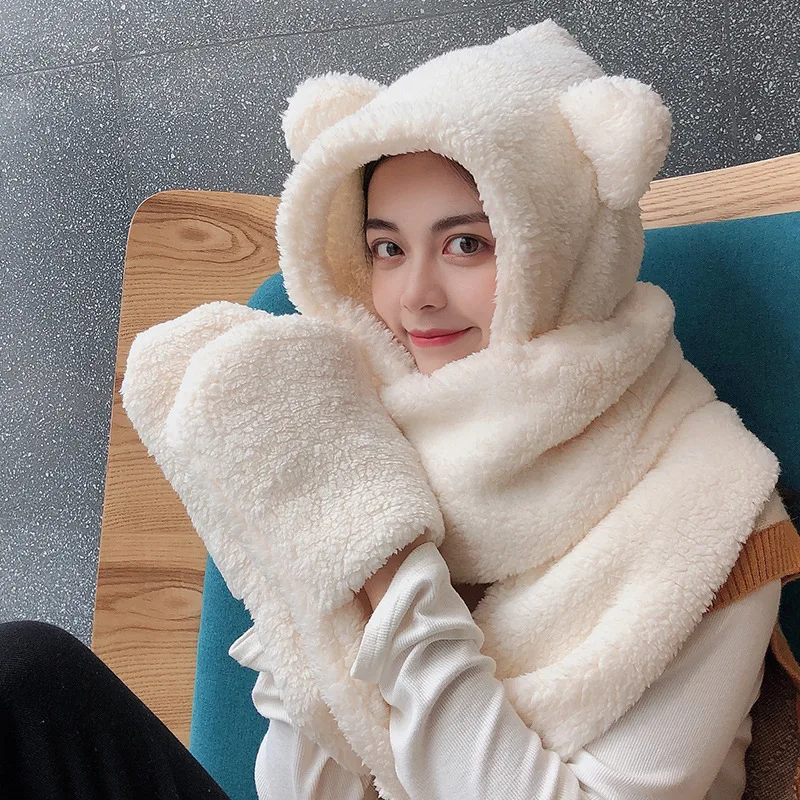 Бархатная шапка из ягненка, женский зимний теплый и холодный шарф с капюшоном и перчатки, комплекты 3-в-1, женский милый медведь, защита ушей, хлопковая шапка с ушками