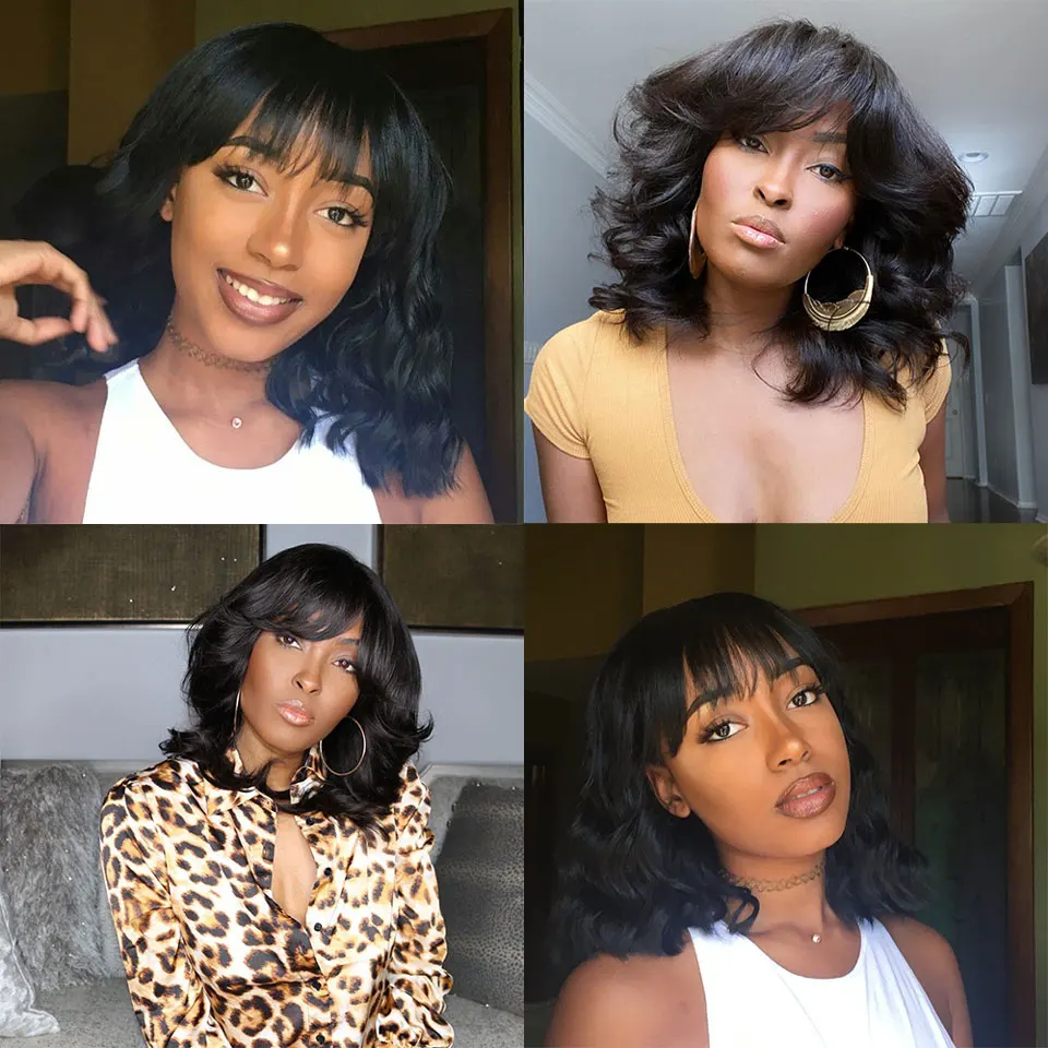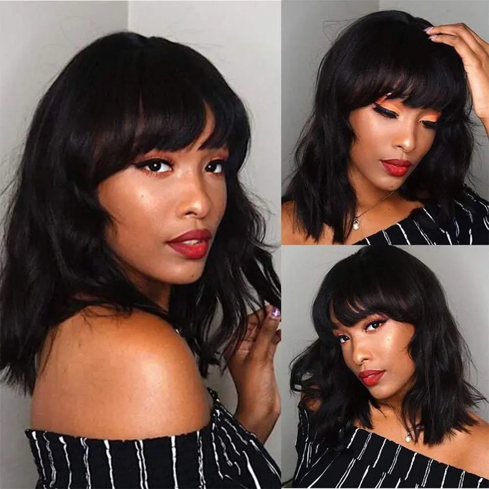 Малазийские человеческие волосы, шелковая основа, полные кружевные парики с челкой, короткий Боб, волнистый шелковый топ, полный кружевной парик 12 дюймов, плотность 180%