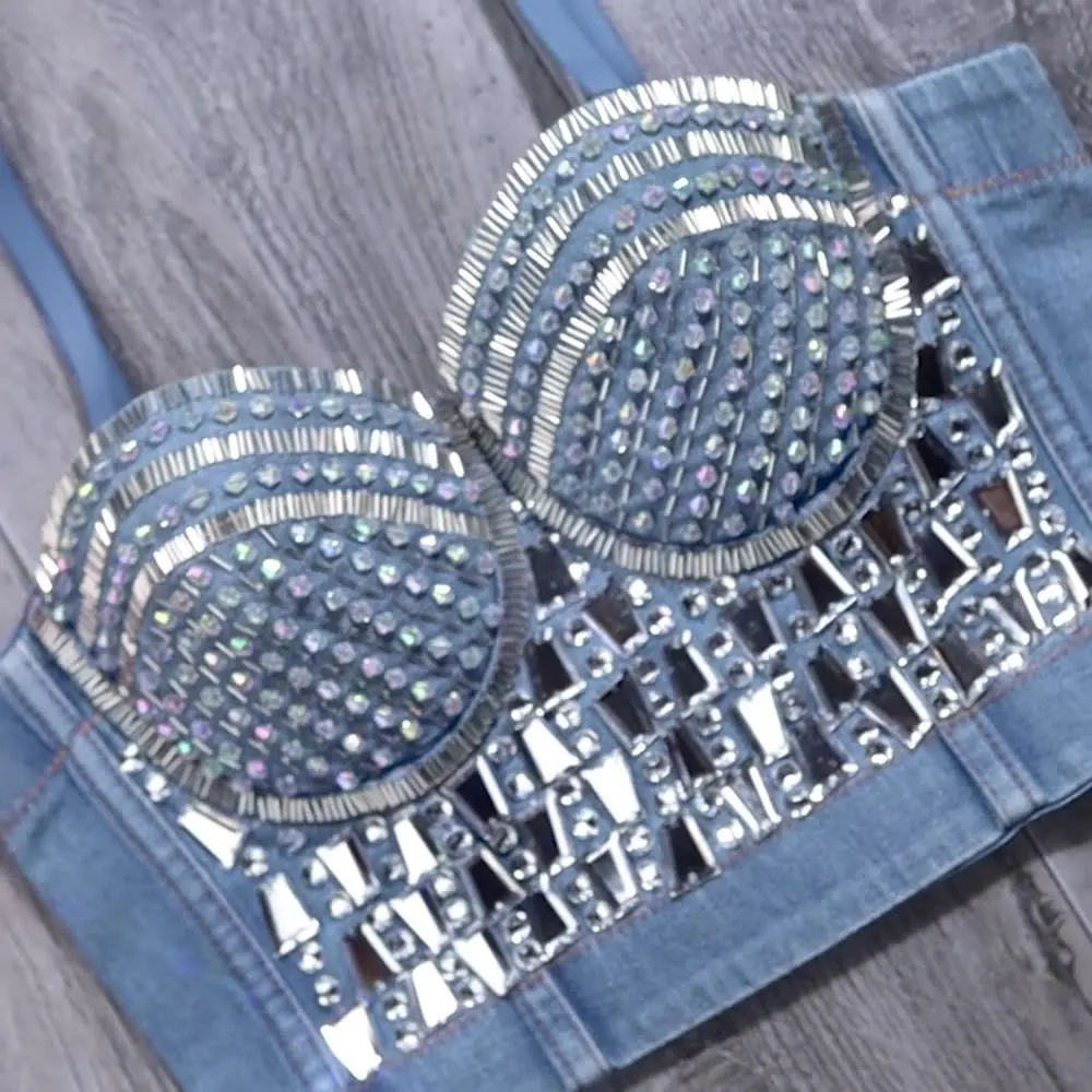 Укороченный корсет с блестками Стразы, топы из джинсовой ткани с бр...