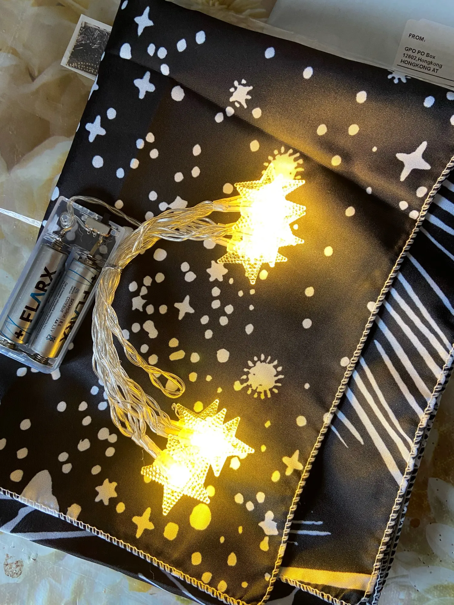 Печать не очень хорошая, рисунок размытый. На фото гирлянда из трех звеньев, а пришла с одним - провод от нее короткий, так что нужно придумывать, куда прятать отсек с батарейками
