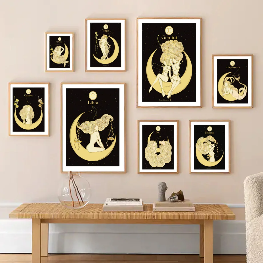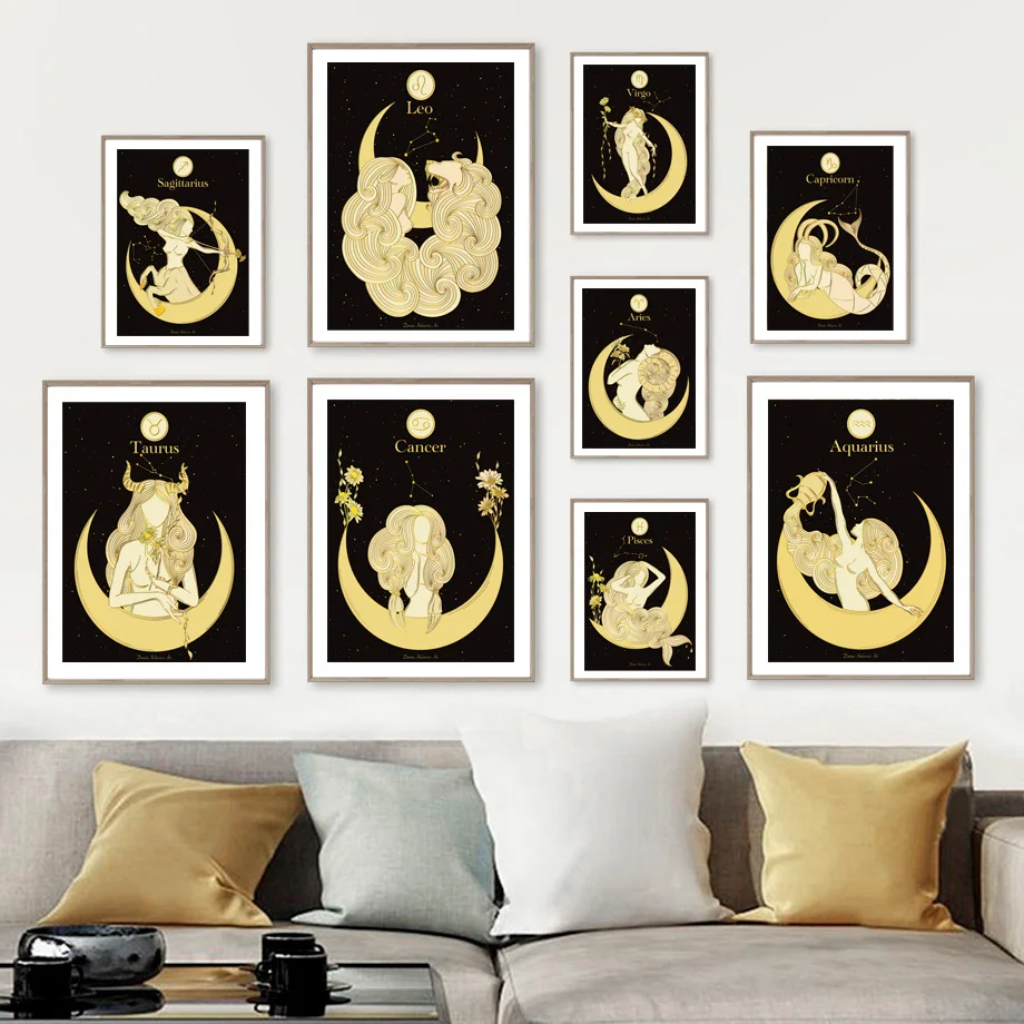 Черный и золотой Зодиак Лев Близнецы Дева Астрология скандинавский плакат настенные художественные принты Холст Картина Декор картинки для гостиной