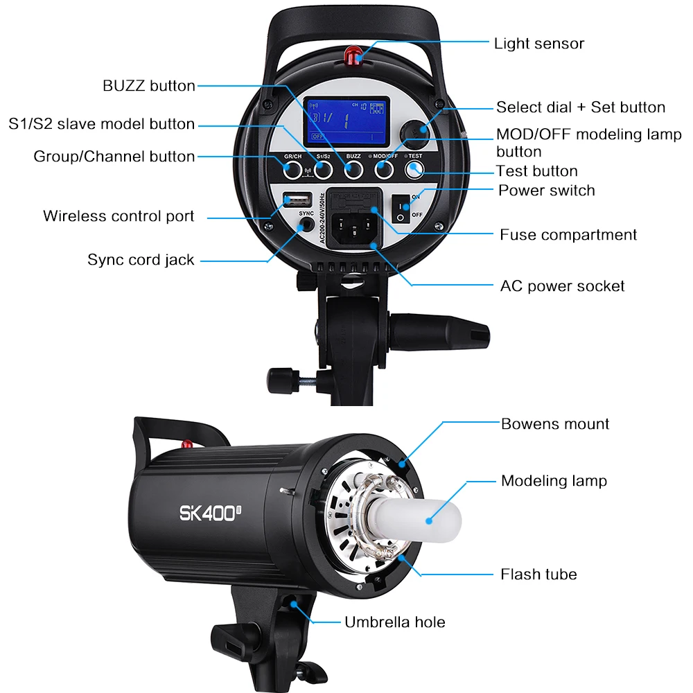 Студийная Вспышка SK400II-это компактная и прочная вспышка с полными функциями. Со встроенной беспроводной системой 2,4G X, это экономичный компактный флэш-стробоскоп для съёмки продукта электронной коммерции, студийного портрета и фотографии образа жизни. В небольшой и средней студийной съемке он может работать как высокий светильник, фоновый светильник или светильник для волос.Особенности:Встроенная беспроводная система 2,4G X. GN65; 5600K; Максимальная мощность: 400ws.Точное выходное отображается на ЖК-дисплей панель, 40 шагов от 1/16 до 1/1 (или 6,0 до 10,0).Используйте дополнительный триггер X1, XT16 или FT-16 для управления коэффициентом мощности вспышки, моделирующей лампой и зуммером, а также триггером вспышки.Компактный и легкий корпус с креплением Bowens, чтобы добавить практически любые формы студийного освещения.Моделирующая лампа 150 Вт может регулироваться от 5% до 100% уровней мощности.Непревзойденная Выходная стабильность, не более 2% сдвигов при одинаковой выходной мощности.Функция Anti-preflash обеспечивает синхронизацию с камерами, оснащенными системой one-preflash.Автоматическая память и восстановление настраиваемых настроек панели.Характеристики:Максимальная мощность: 400WSНомер направляющей (m ISO 100): 65Цветовая температура: 5600 ± 200KРабочее напряжение:Штепсельная Вилка европейского стандарта, AC200-240V/50 Гц/Штепсельная Вилка стандарта Великобритании, штепсельная вилка стандарта AC220-240V/50 Гц/США, AC100-120V/60 Гц/штепсельная вилка стандарта Австралии, штепсельная вилка AC250V/JP, AC250VМощность Выход Управление: Выкл, 6,0-10,0 (1/16-1/1)Моделирующая лампа: 150 ВтУровень модельной лампы: 5% ~ 100%Время рециркуляции: 0,1 ~ 1,0 sМетод запуска: Синхронизация шнура, Тестовая кнопка, пусковое устройство, порт беспроводного управленияПродолжительность вспышки: 1/2000s до 1/800sПредохранитель: 5AТовар Размеры: флэш-Диаметр: 12,7 см, высота вспышки с ручкой: 23,2 см, длина вспышки с моделирующей лампой: 38 смВес изделия: 2213 г/78,1 унцийПосылка Размеры: 44*27*21,5 см/17,3*10,6 * 8.5inВес посылка: 3495 г/123,3 унцийПосылка:1 * студийная вспышка1 * кабель питания(Вилка европейского стандарта)/(вилка австралийского стандарта)/(вилка американского стандарта)/(вилка британского стандарта)/(вилка JP)1 * крышка лампы1 * моделирующая лампа2 * Предохранитель1 * Руководство пользователя (английский и китайский)