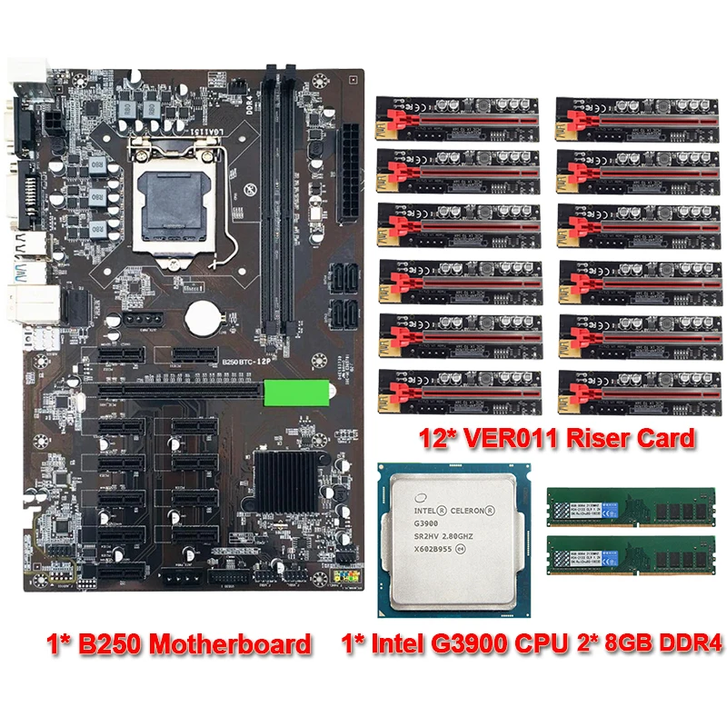 Материнская плата для майнинга B250, поддержка 12 GPU LGA1151 с процессором G3900, PCI-E слот, 8 Гб памяти DDR4, Биткоин, ethernet, Майнер