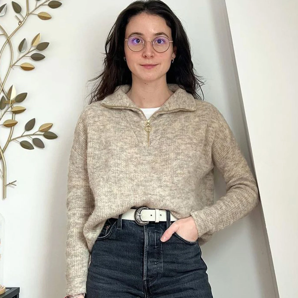 Ажурный жаккардовый джемпер для женщин, Зимний пуловер с длинным рукавом и отложным воротником на молнии, топы, повседневные женские винтажные свитера