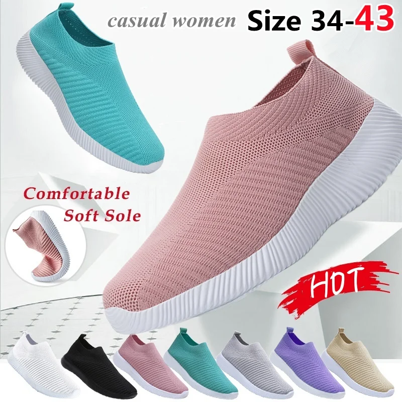 Женские сетчатые кроссовки без шнуровки, мягкие дышащие, Повседневная вязаная обувь на плоской подошве, Размеры 35-43