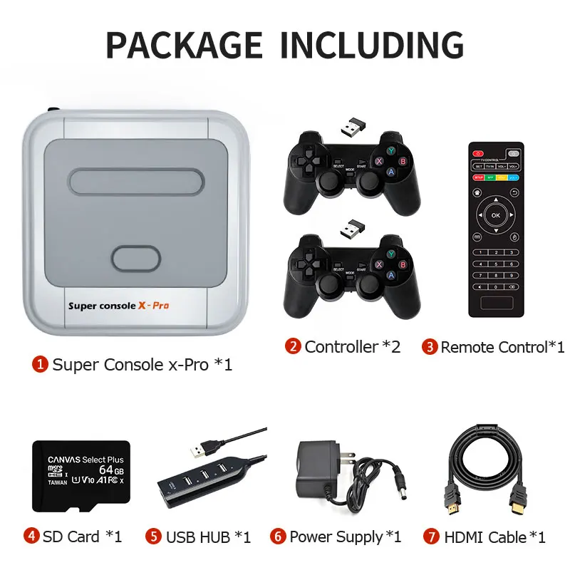 Super console X Pro подходит для телевизора 4K, поддерживает подключение HDMI/AV, качество изображения высокой четкости 1080P, мы можем легко наслаждаться яркими и захватывающими видеоиграми на большом экране