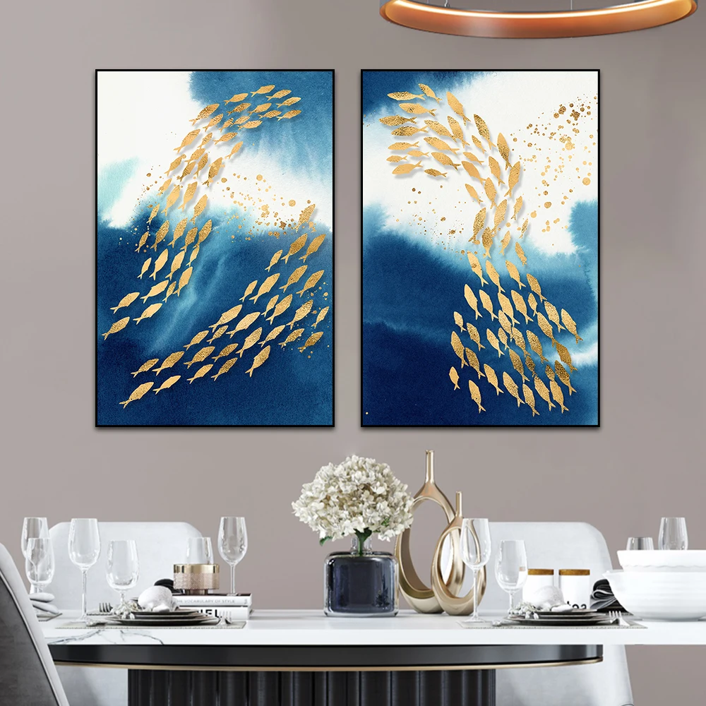 Настенная картина в современном абстрактном скандинавском стиле, холст с изображением золотой рыбы, синего моря, постер, украшение для дома, настенная живопись для гостиной